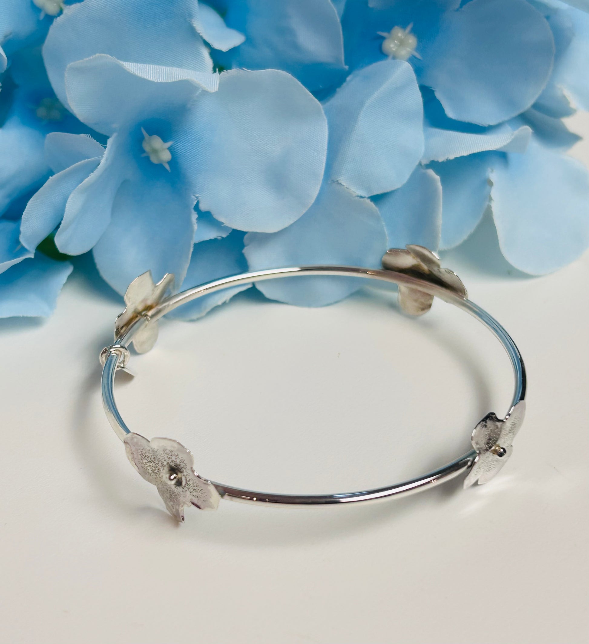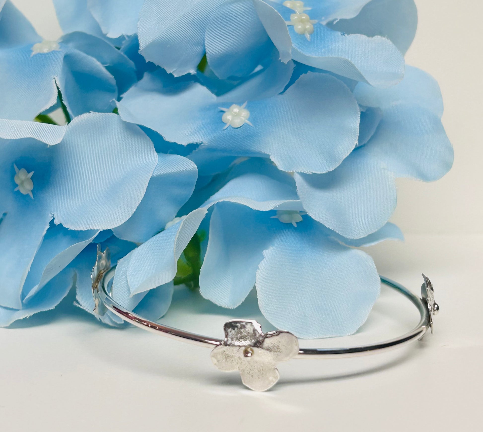 An absolute stunner! If you adore the Hydrangea Flower, this piece is for you. Our Hydrangea Blossoms are handcrafted in sterling silver and sprinkled around our solid sterling silver slip-on bangle bracelet. A unique look to wear with layers of bracelets or alone. Made to fit loosely. A beautiful piece for the Hydrangea girl!