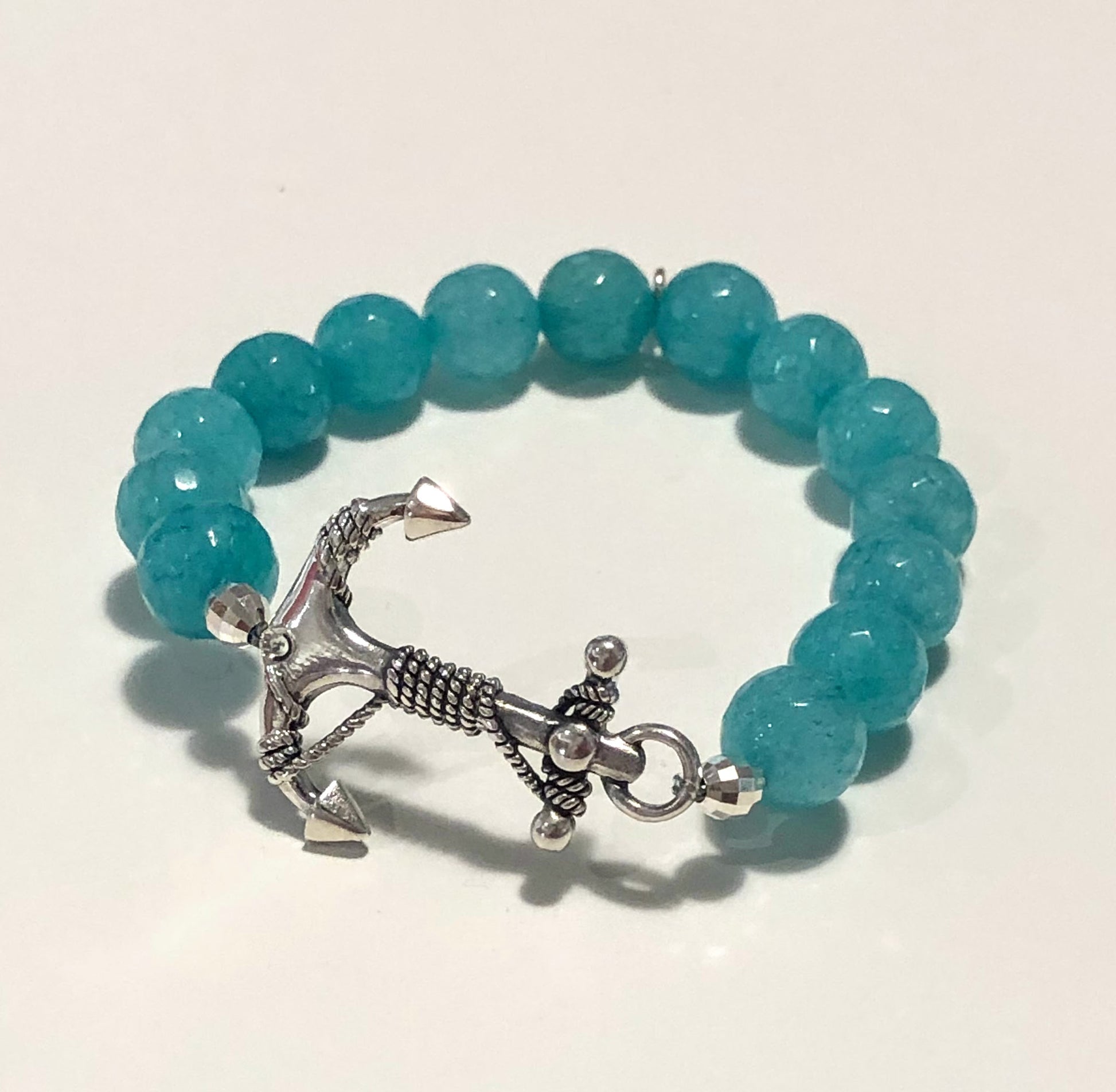 Ahoy Mates! Our beautifully detailed, solid Sterling Silver Anchor is hand strung with stunning aqua Agate gemstone beads and sparkly Sterling Silver accents. Strong and stretchy for easy on and off daily wear. A beautiful bracelet to add to any nautical jewelry collection. One size fits most