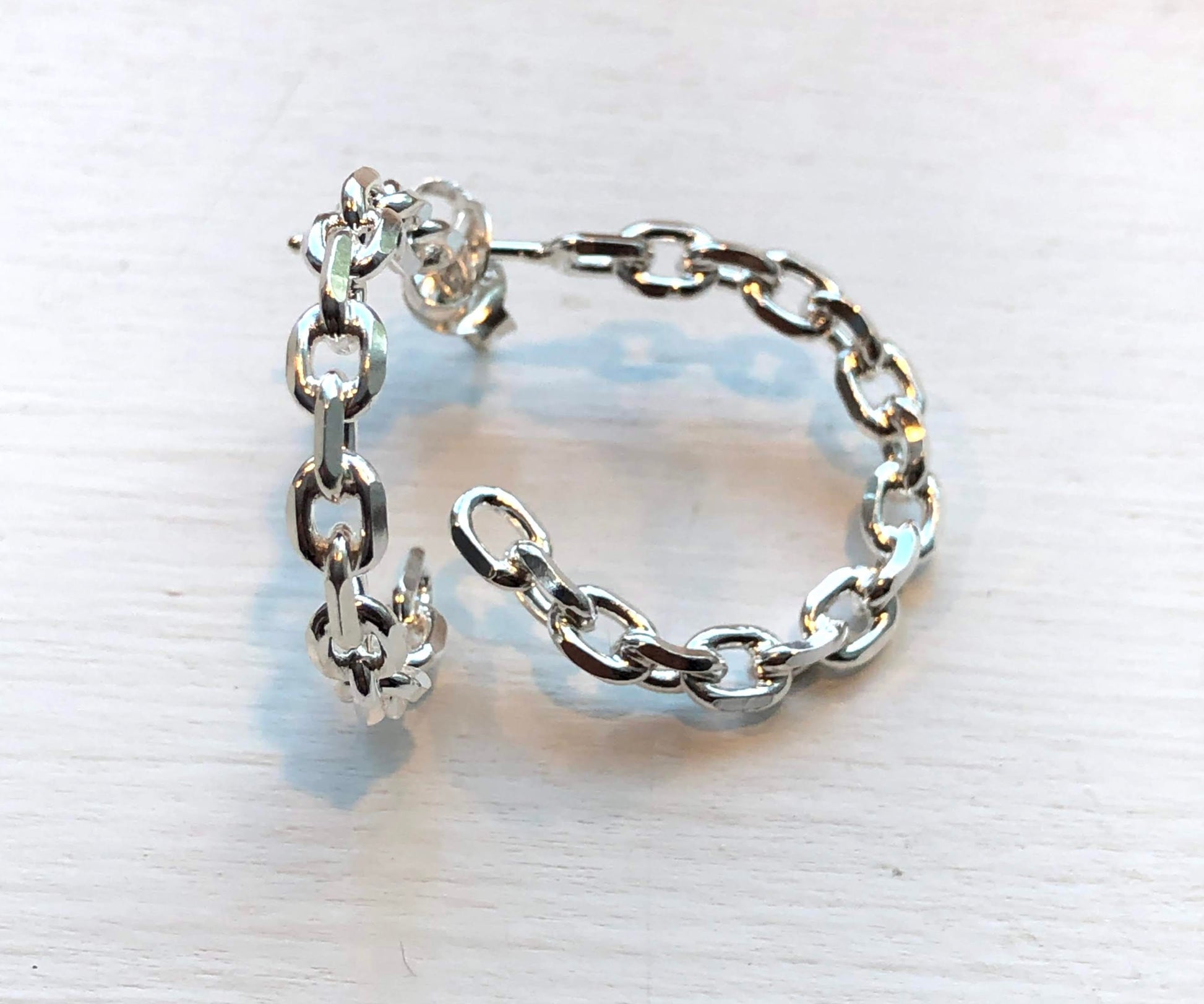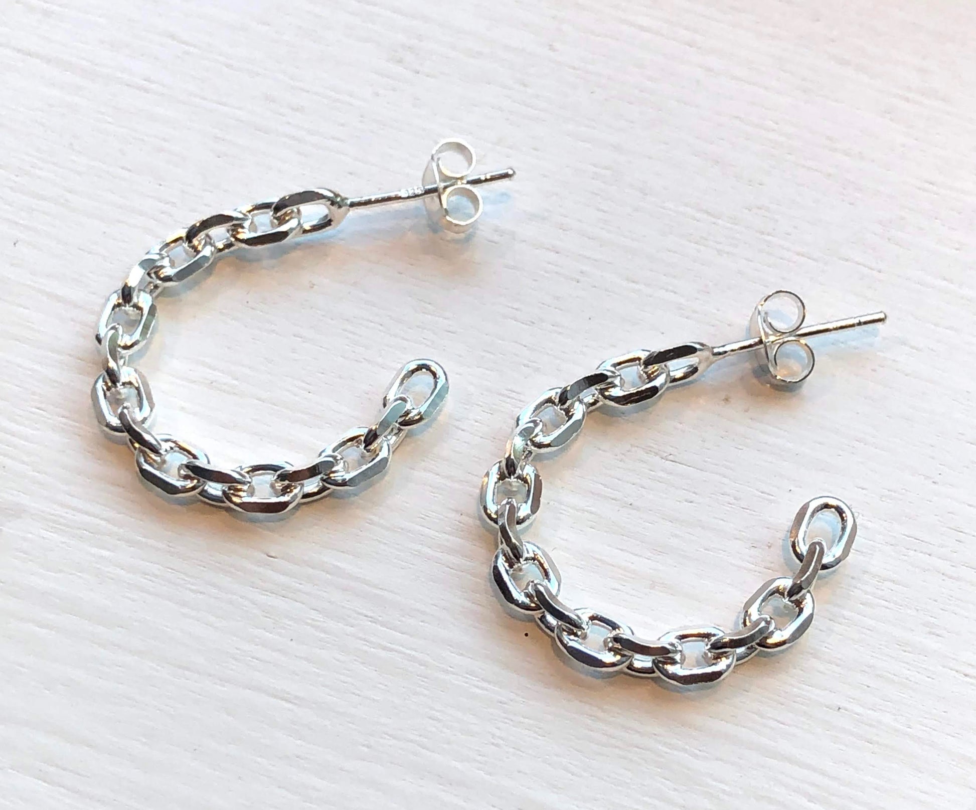 Solid sterling silver anchor link hoops are just the right size for daily wear. A fashionably perfect nautical earring for any beach girl.