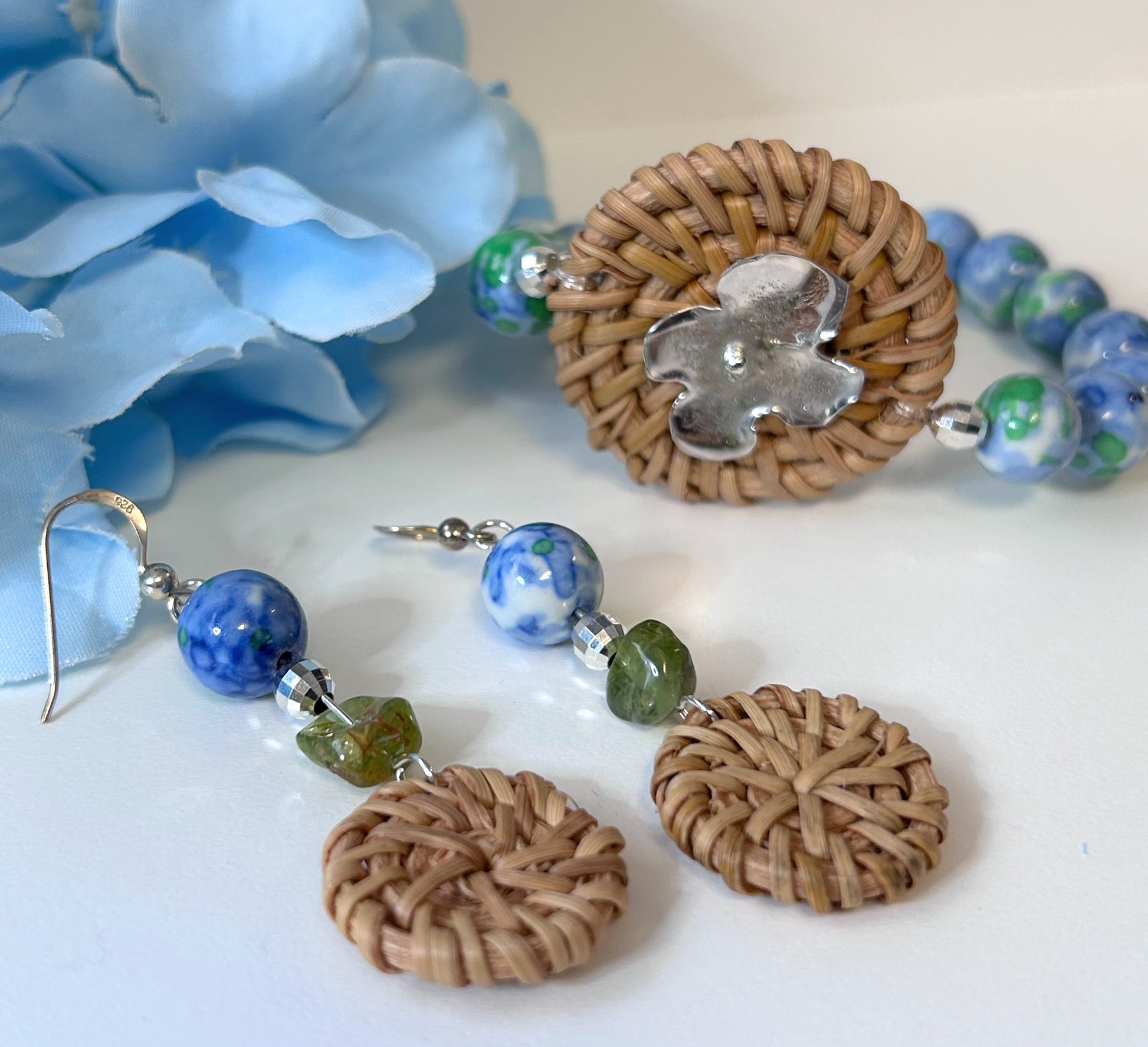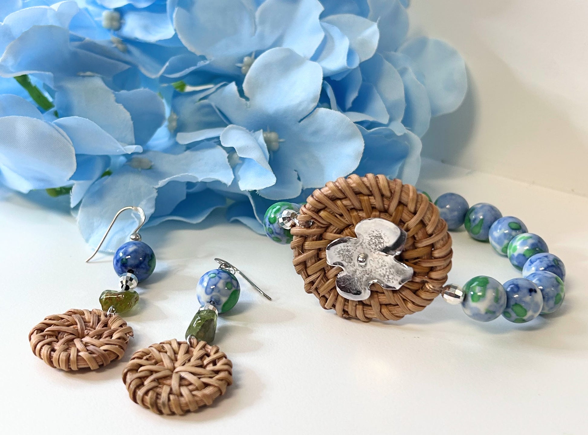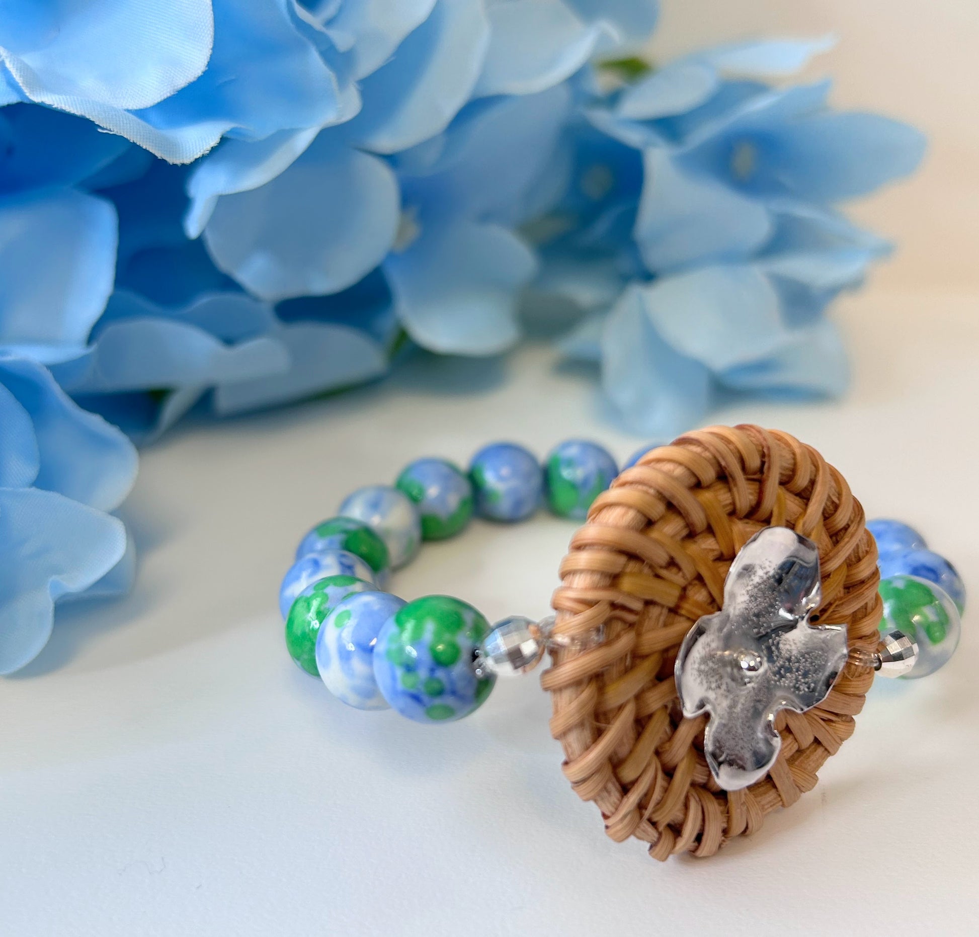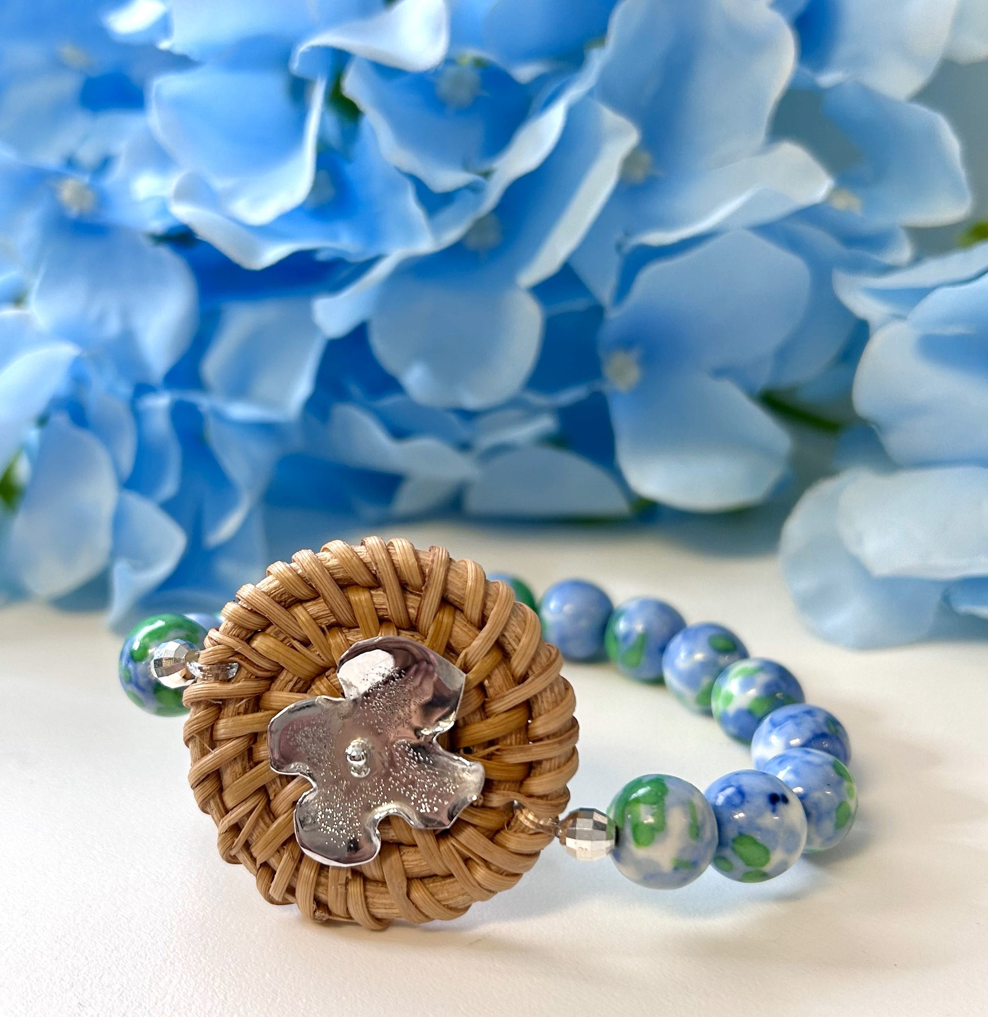 Stunning! Our beautiful one of a kind, Hydrangea Blossom is hand crafted in sterling silver and set atop a woven rattan basket weave, hand strung with pretty hydrangea blue beads with pops of green that remind you of the colors of hydrangeas in summertime. All strung on super-strong stretch cord for easy on/off wear. Sparkly sterling silver accent beads complete this pretty piece.