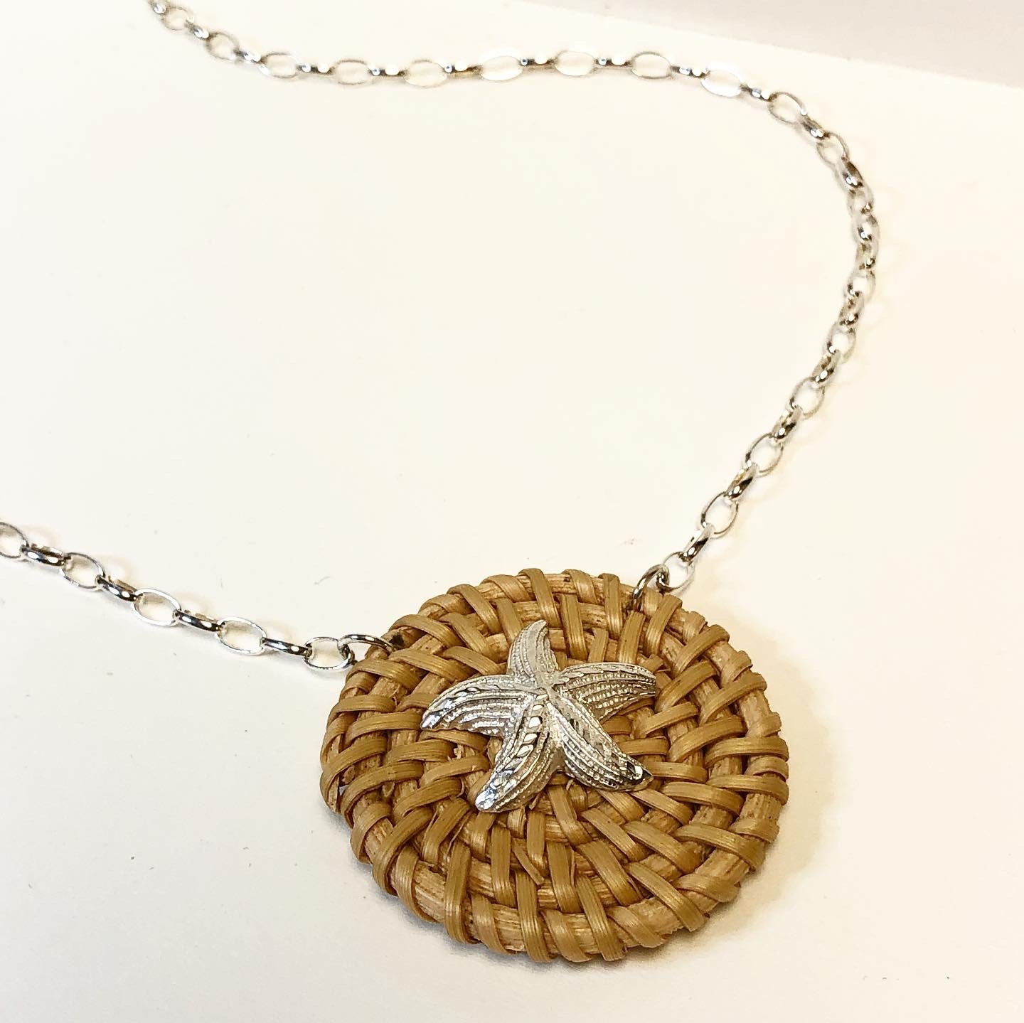 Our basket top Starfish necklace is reminiscent of the Nantucket Basket, with a resort style twist. Traditional basket weave base is designed with a sterling silver Starfish, and handcrafted with a sterling silver paperclip style chain. A fusion of classic and modern. Beautiful styled with casual beach wear, a sweet sundress or a high fashion resort wear.