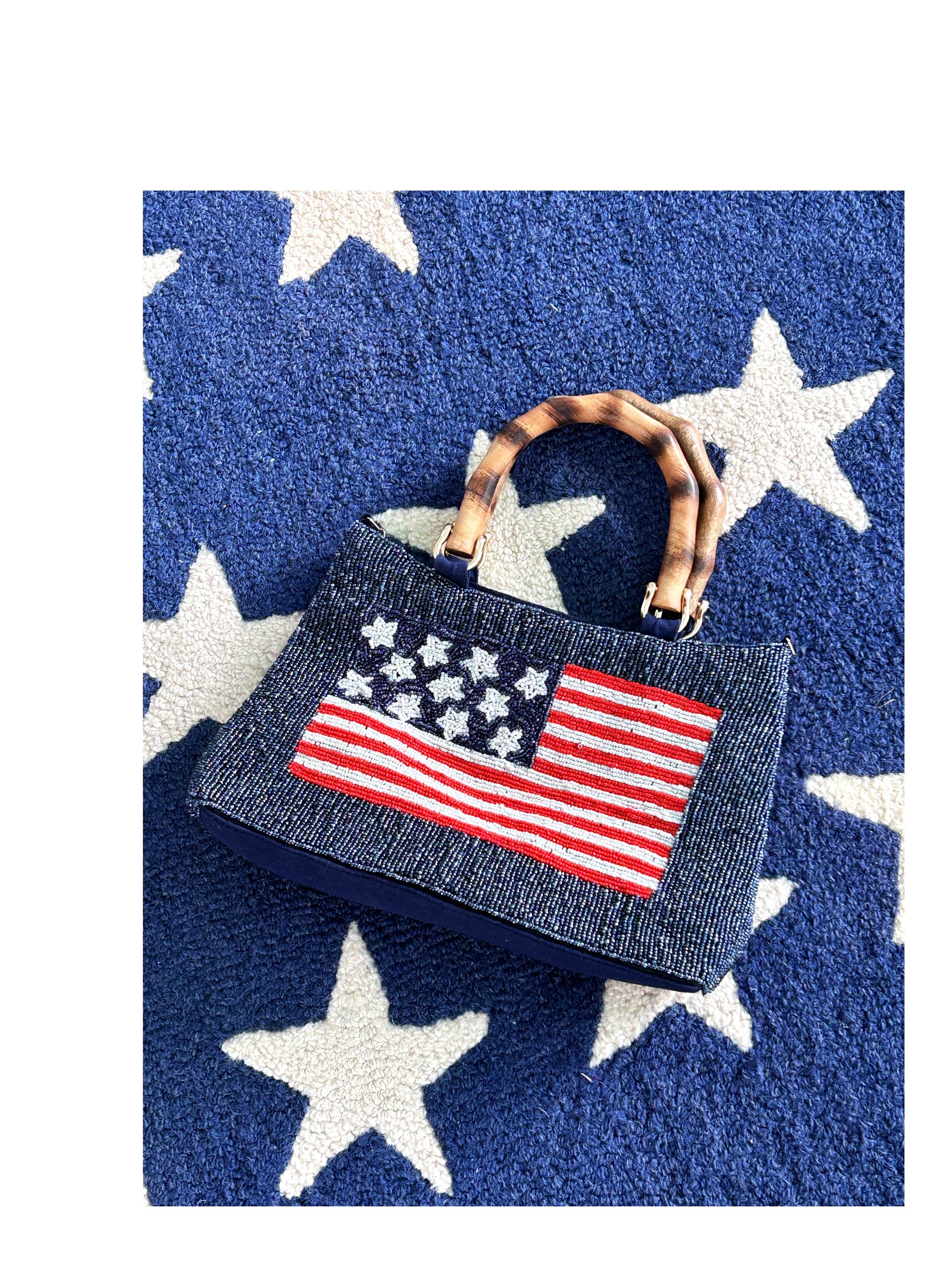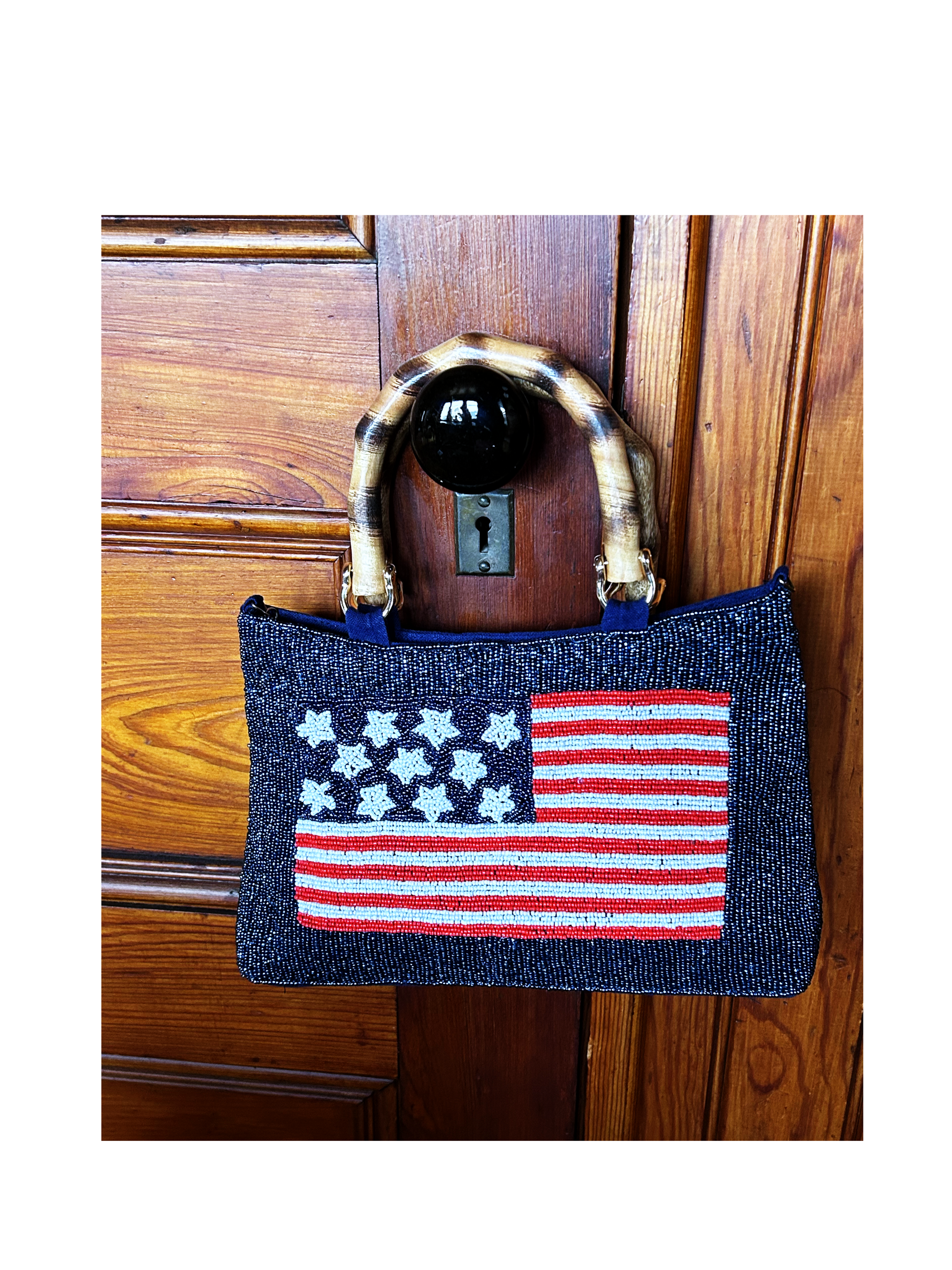 USA Proud! This stunning beaded American Flag tote style handbag features a navy beaded background and a beautiful beaded American Flag. A plain blue canvas back and satin inside finishes this high end bag. Other features include bamboo handles, a zipper closure, inside pocket and a pretty removable chain to convert to a cross body style.