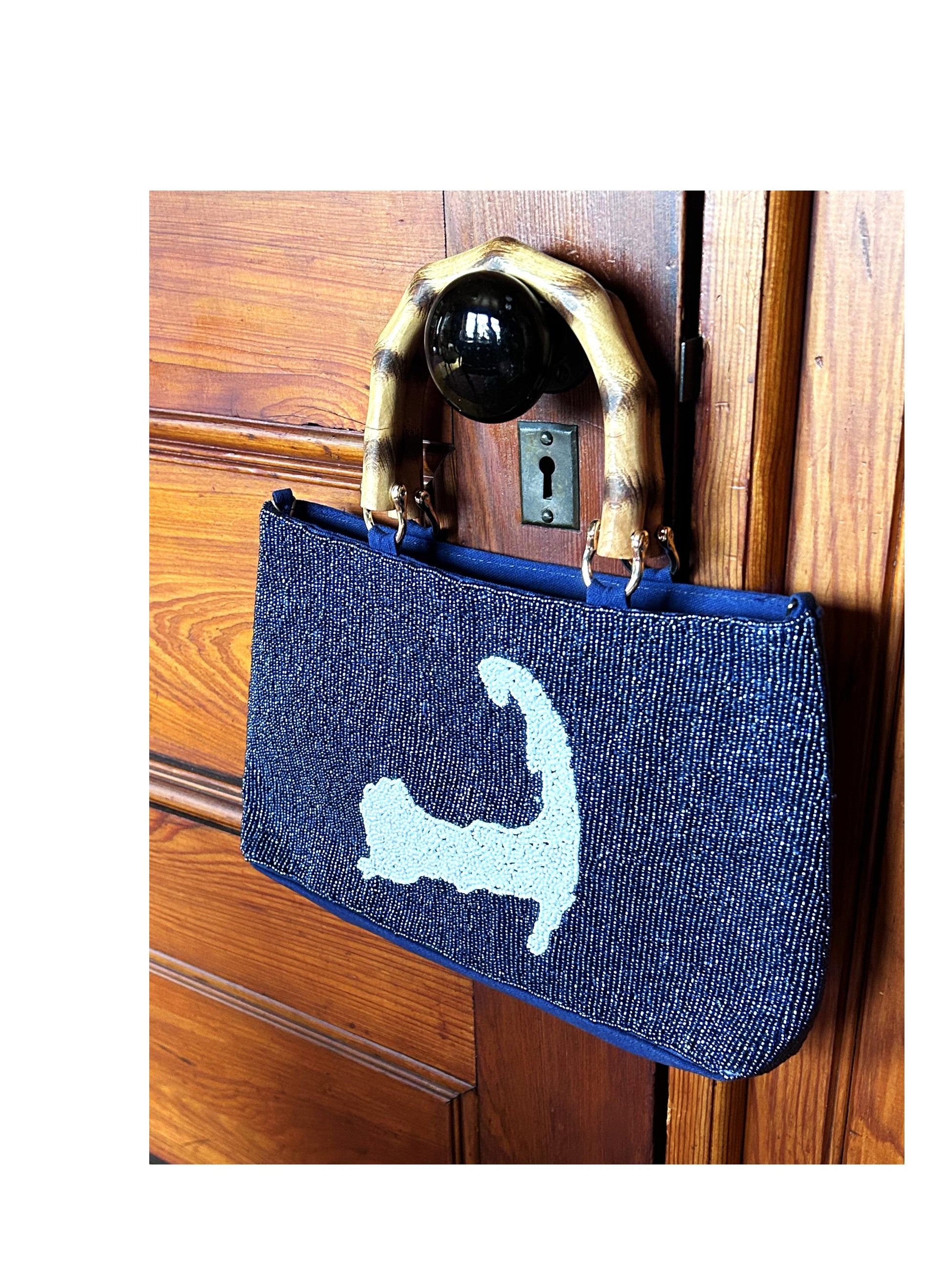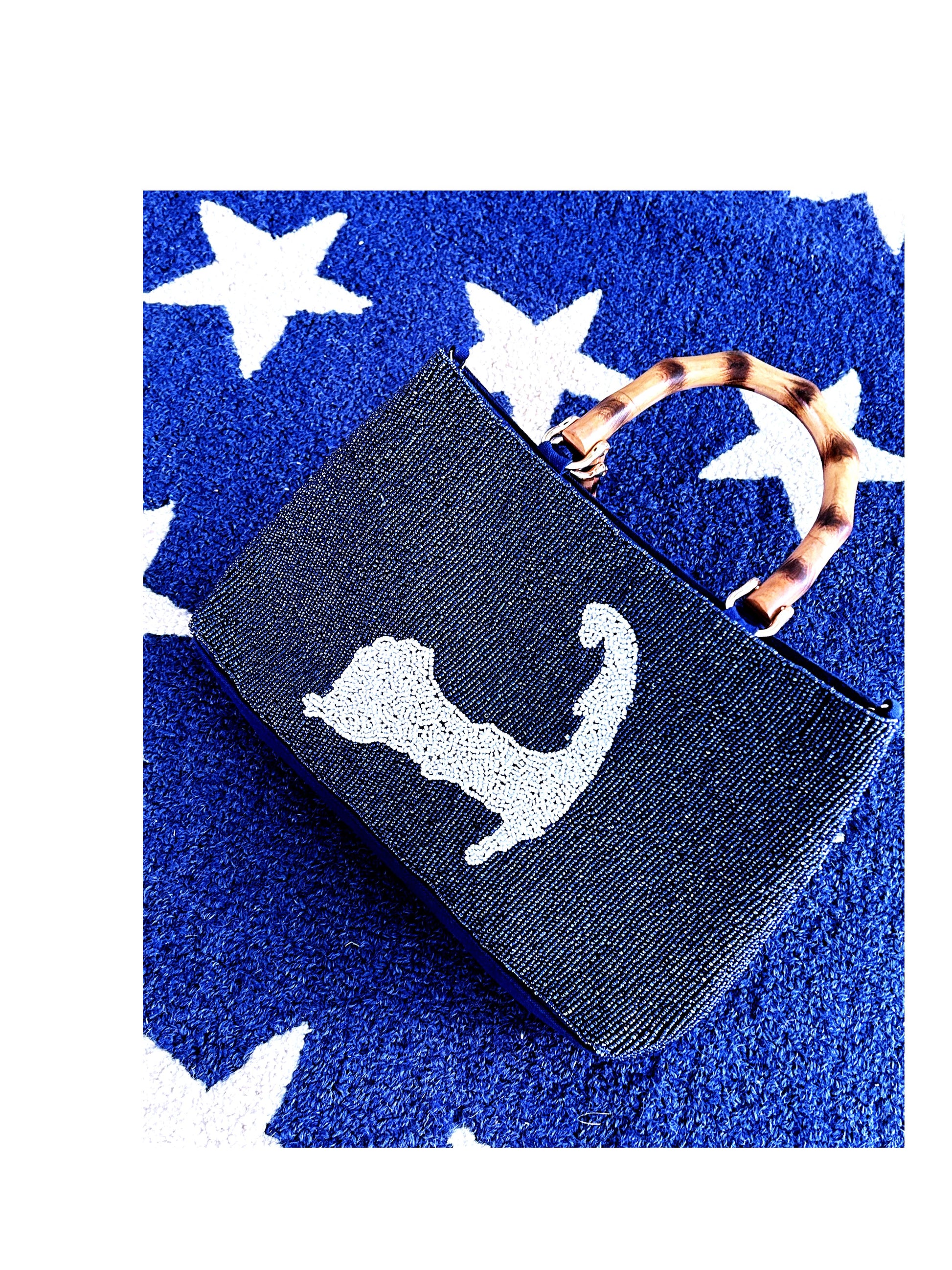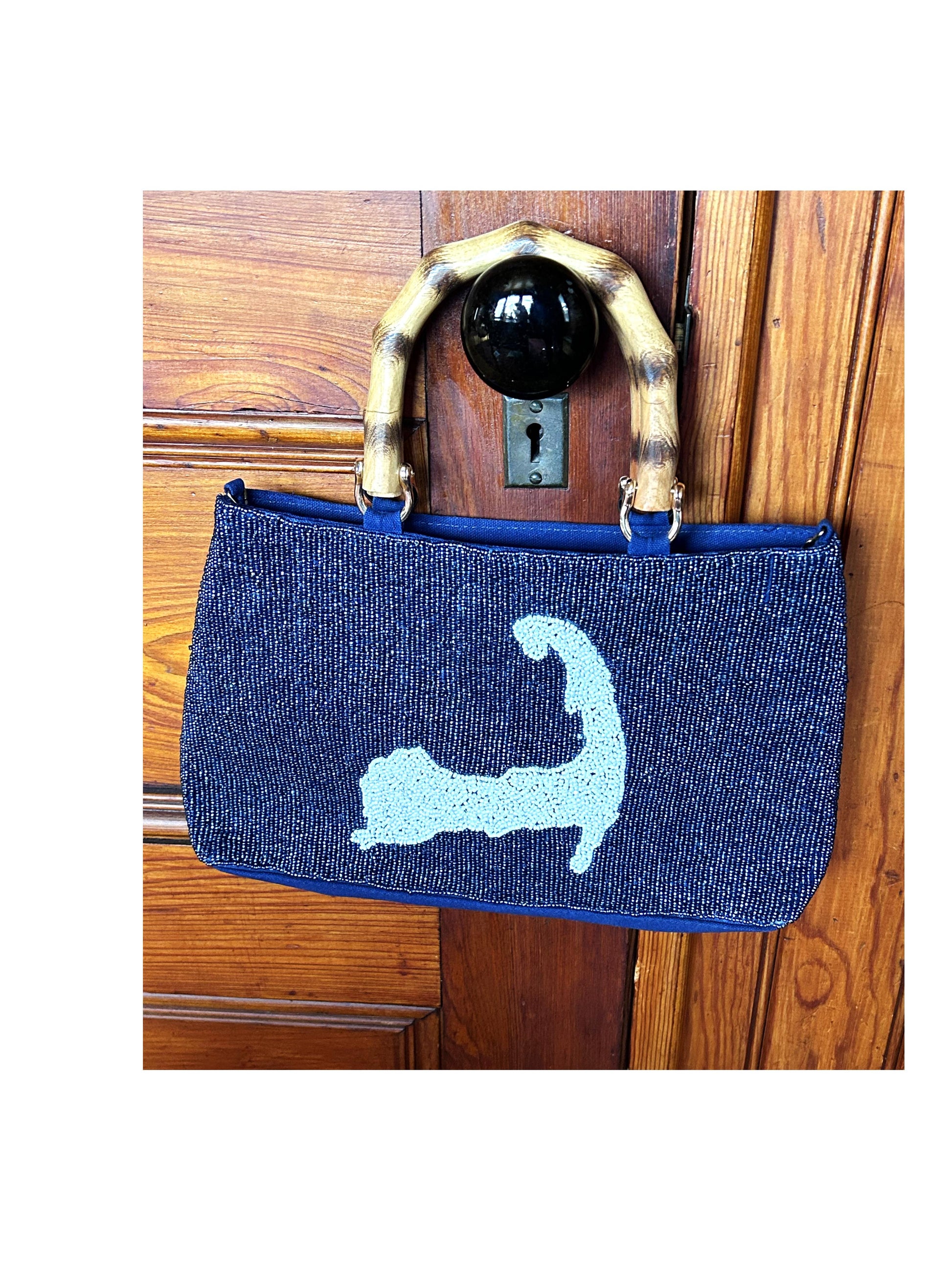 This stunning beaded Cape Cod tote style handbag features a navy beaded background and a beautiful beaded white Cape Cod Map. A plain blue canvas back and satin inside finishes this high end bag. Other features include bamboo handles, a zipper closure, inside pocket and a pretty removable chain to convert to a cross body style.
