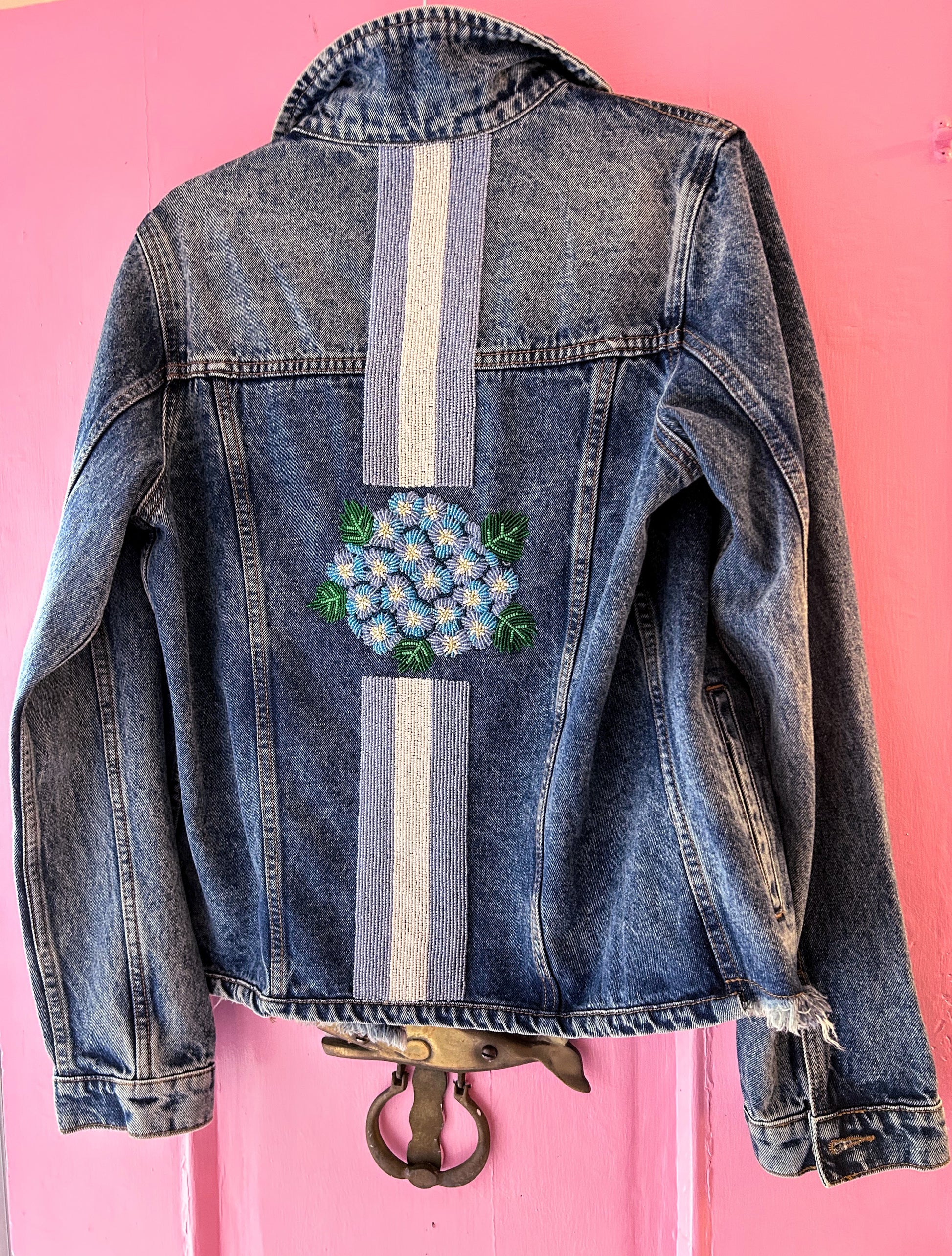Made just for us! Our exclusive beaded hydrangea jacket is stunningly unique, 100% cotton this pretty jacket features a fringed hem front and beautifully beaded back. Pretty beaded Hydrangea flowers sit between blue and white beaded stripes. Perfect to wear for any occasion and all year long. A classic addition to any Hydrangea lover's closet!