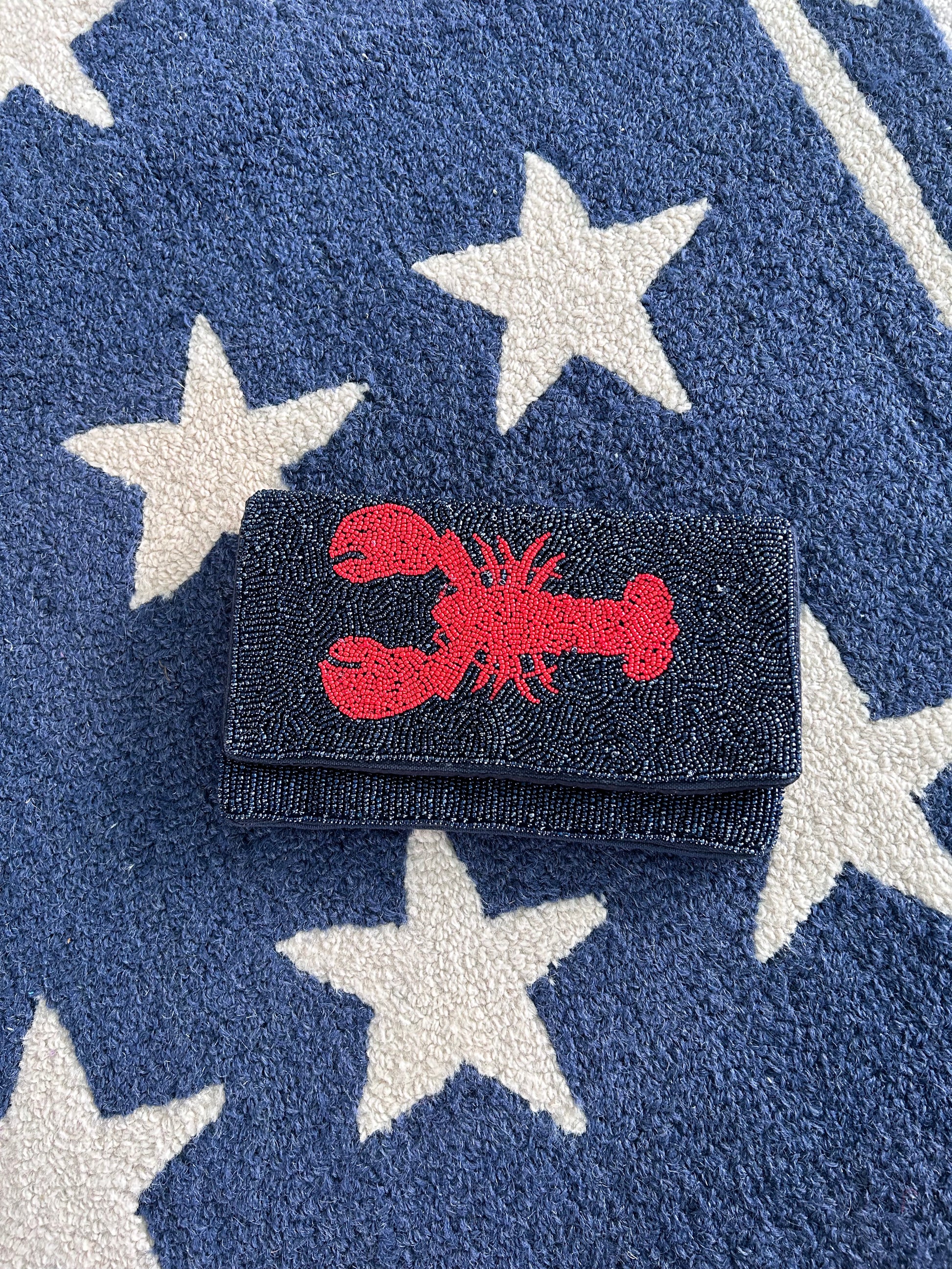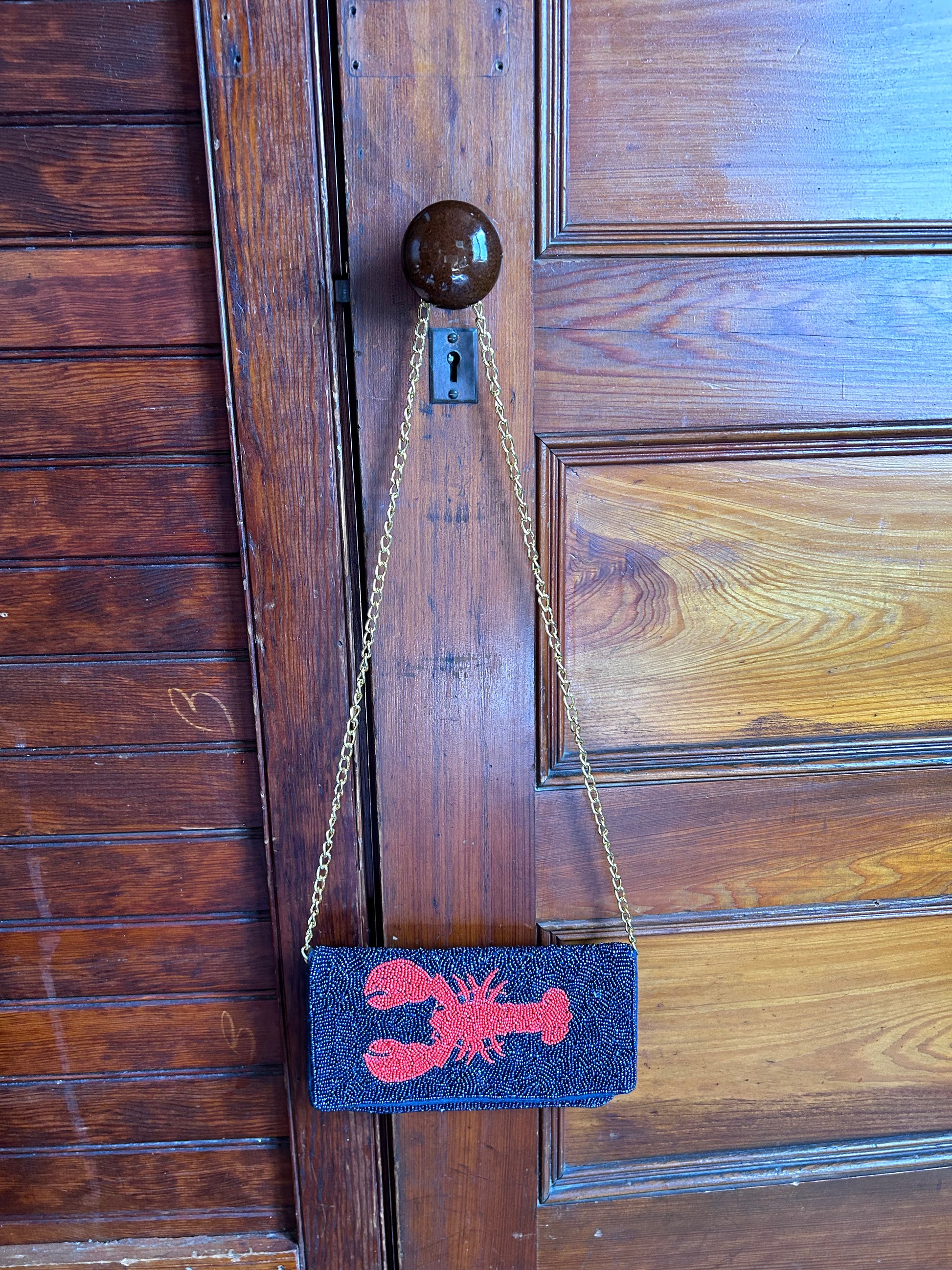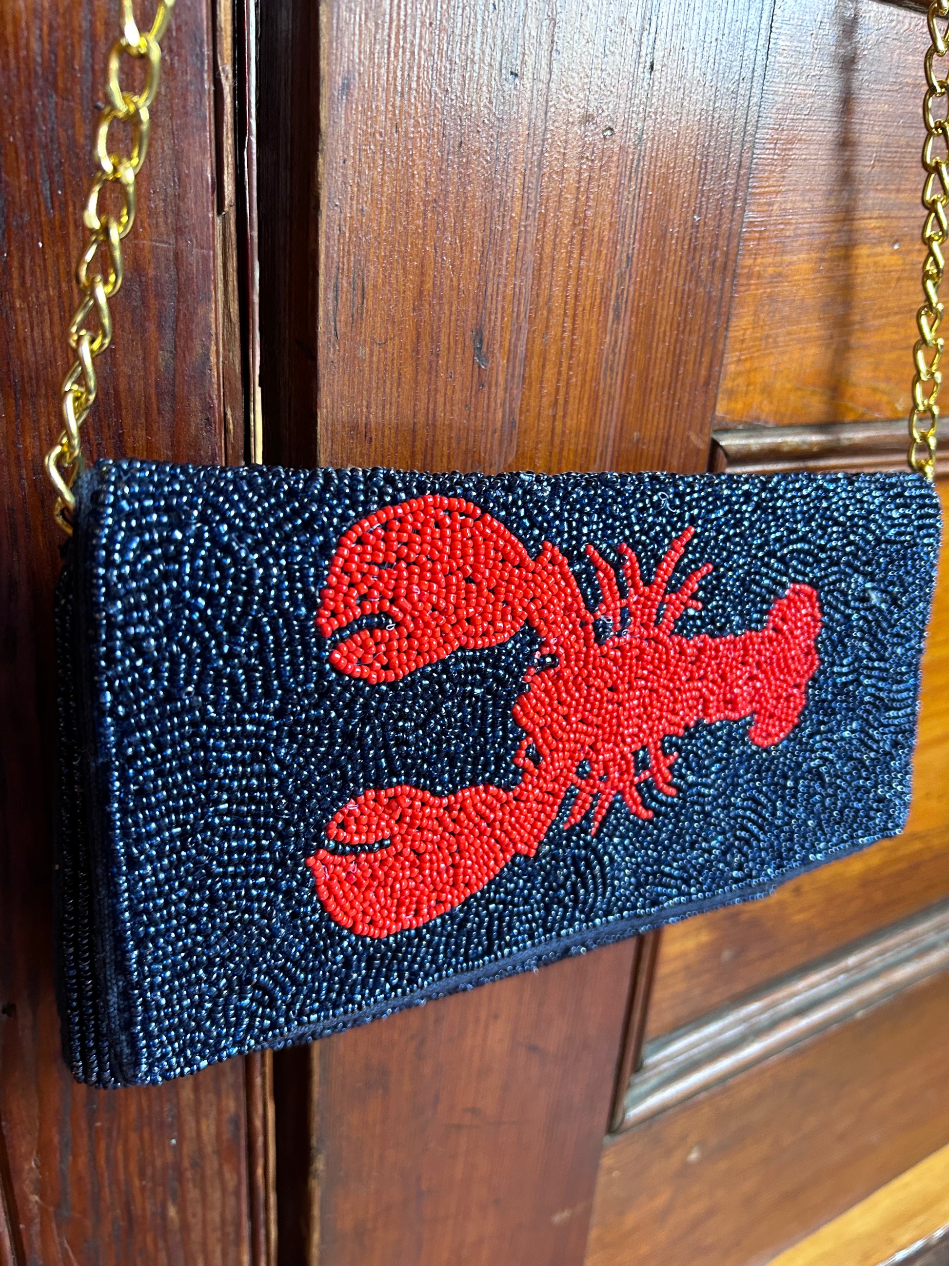 This stunning beaded Lobster clutch style handbag features a navy beaded background and a beautiful beaded Red Lobster. A plain blue canvas back and inside finishes this high end bag. Other features include an inside pocket and a pretty removable chain to convert to a cross body style.