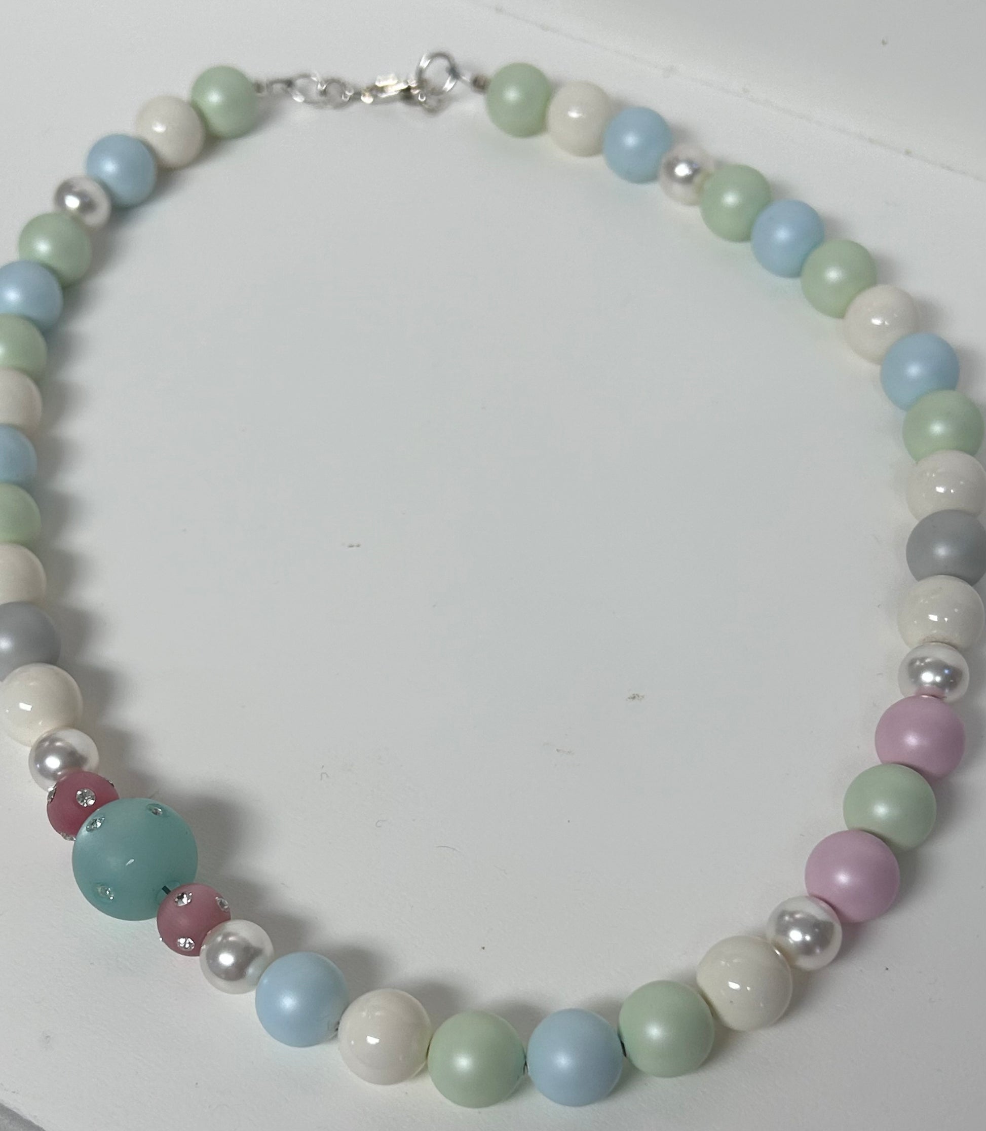 This one of a kind beaded necklace has been designed with beautiful shades of pretty pastels. Austrian crystal pearls thoughtfully strung with fiber optic glass accents beads, set with dazzling austrian crystals and finished with a sterling silver lobster clasp. A beautiful piece to wear casual or dressed up. Pair with your favorite diamond studs or pearls for a stunning set. Pictured with our sterling silver Beach Ball hoop earrings in Pink Sky(sold separately)