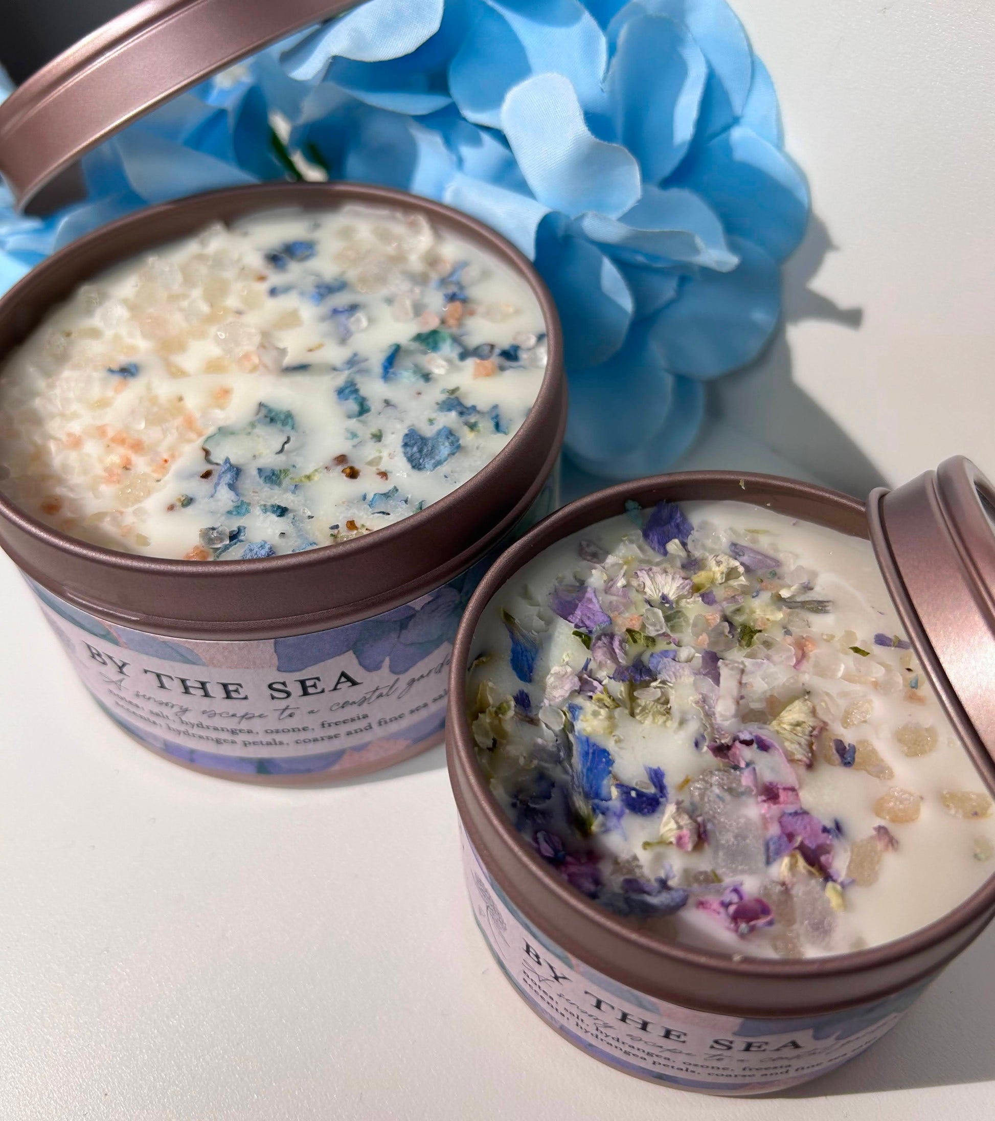 Take a sensory escape to a coastal garden... Topped with dried blue hydrangea petals and a mix of sea salts, this dreamy candle features natural fragrance notes of salt, hydrangea, ozone, and freesia. Watch the salts gently melt away as the petals float on the surface of the liquid wax. Features hydrangeas grown locally in our own garden, along with coarse pacific sea salt and French sel gris for a fascinating mix of color and texture. 100% soy wax candle, packaged in a rose gold tin with a clear window top. The tin is re-usable and perfect for storing small office supplies, hair accessories, or snacks! Handmade in the USA.