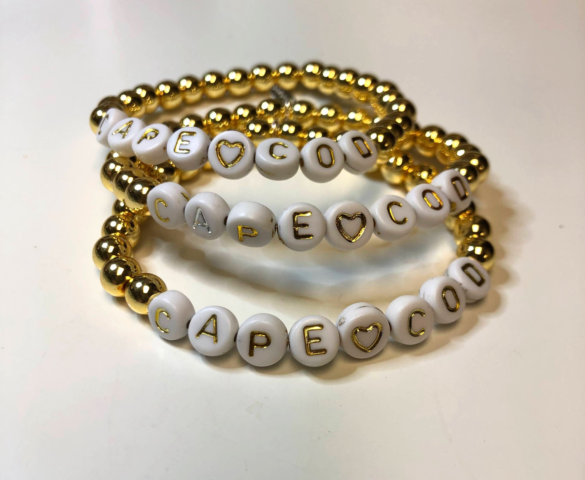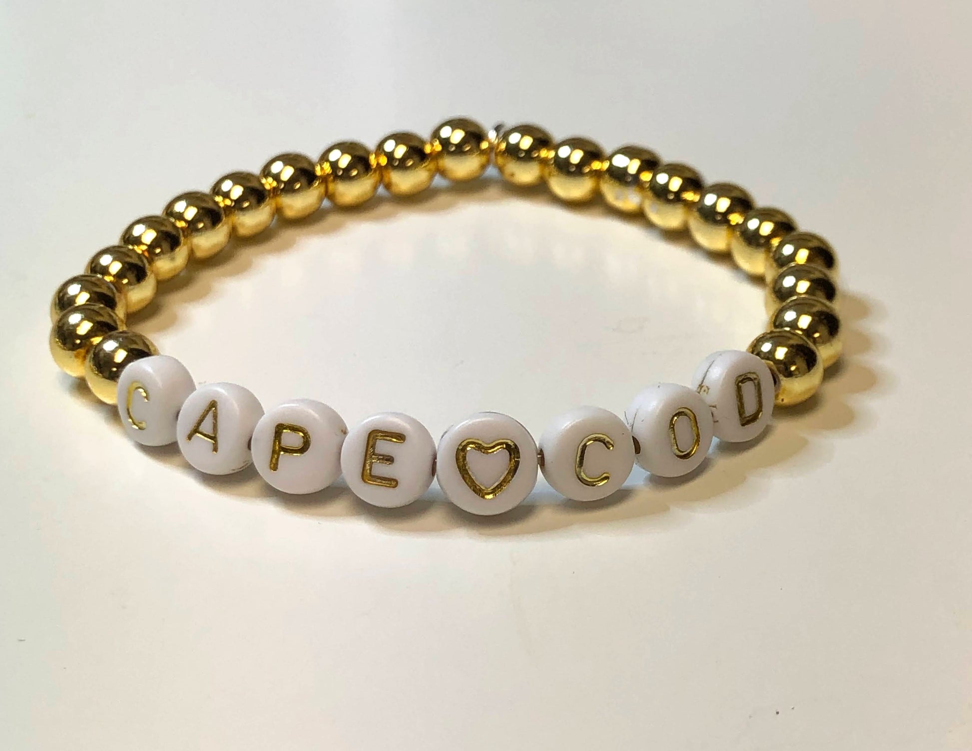 Hand strung with gold accented Cape Cod letter beads and perfectly paired with genuine golden Hematite gemstone beads, all on our SUPER-STRONG stretch cord, for easy on/off wear. An everyday bracelet to show your Cape Cod love!