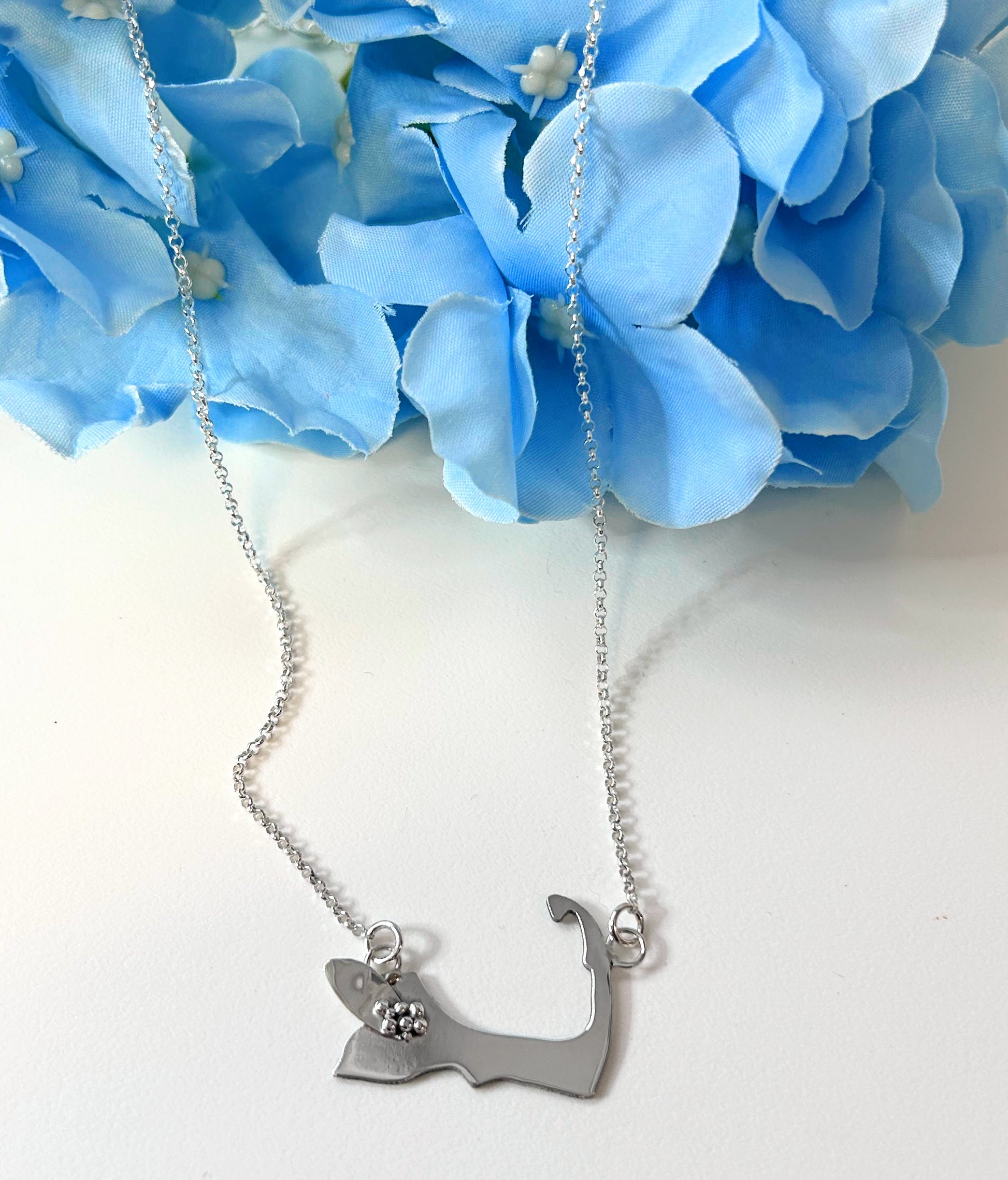 As pretty as a Hydrangea blossom can be, our sweet one of a kind Hydrangea bunch is handcrafted in solid sterling silver, finished to perfection and set atop our sterling silver Cape Cod map and finished with our popular sterling silver sparkle chain. A piece you'll want to wear daily! Perfect for any Cape Cod Hydrangea girl!