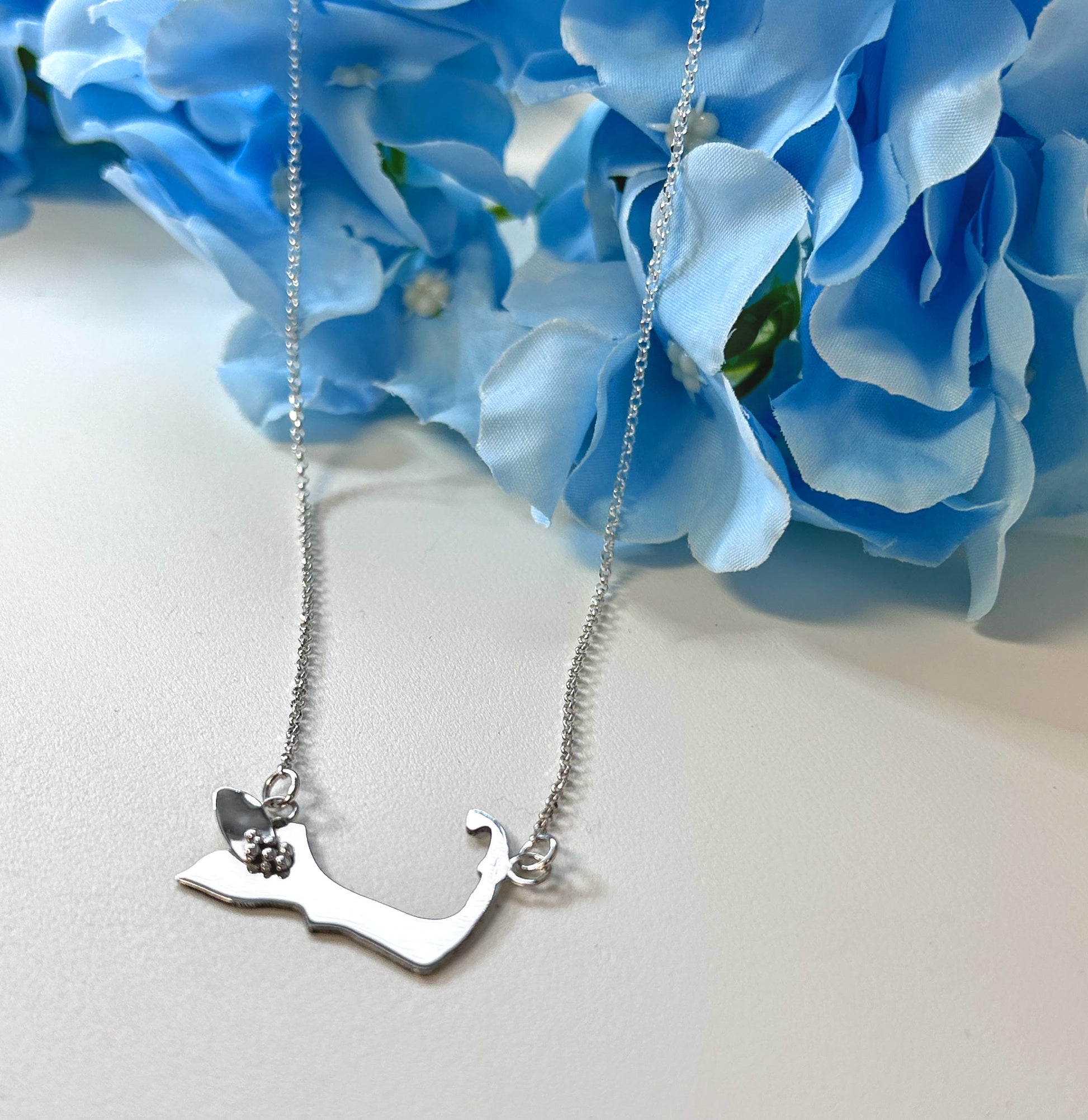 As pretty as a Hydrangea blossom can be, our sweet one of a kind Hydrangea bunch is handcrafted in solid sterling silver, finished to perfection and set atop our sterling silver Cape Cod map and finished with our popular sterling silver sparkle chain. A piece you'll want to wear daily! Perfect for any Cape Cod Hydrangea girl!