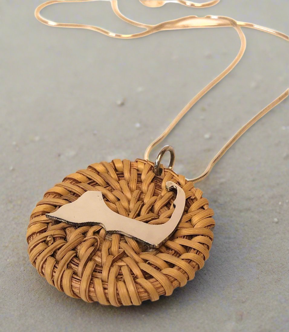 Stylish and beautiful, an updated twist on a classic design. Our handcrafted, sterling silver Cape Cod map sits atop a woven rattan base, reminiscent of the traditional Nantucket basket creating a stunning resort style piece. A smooth sterling silver chain and sterling silver bail finishes the design.