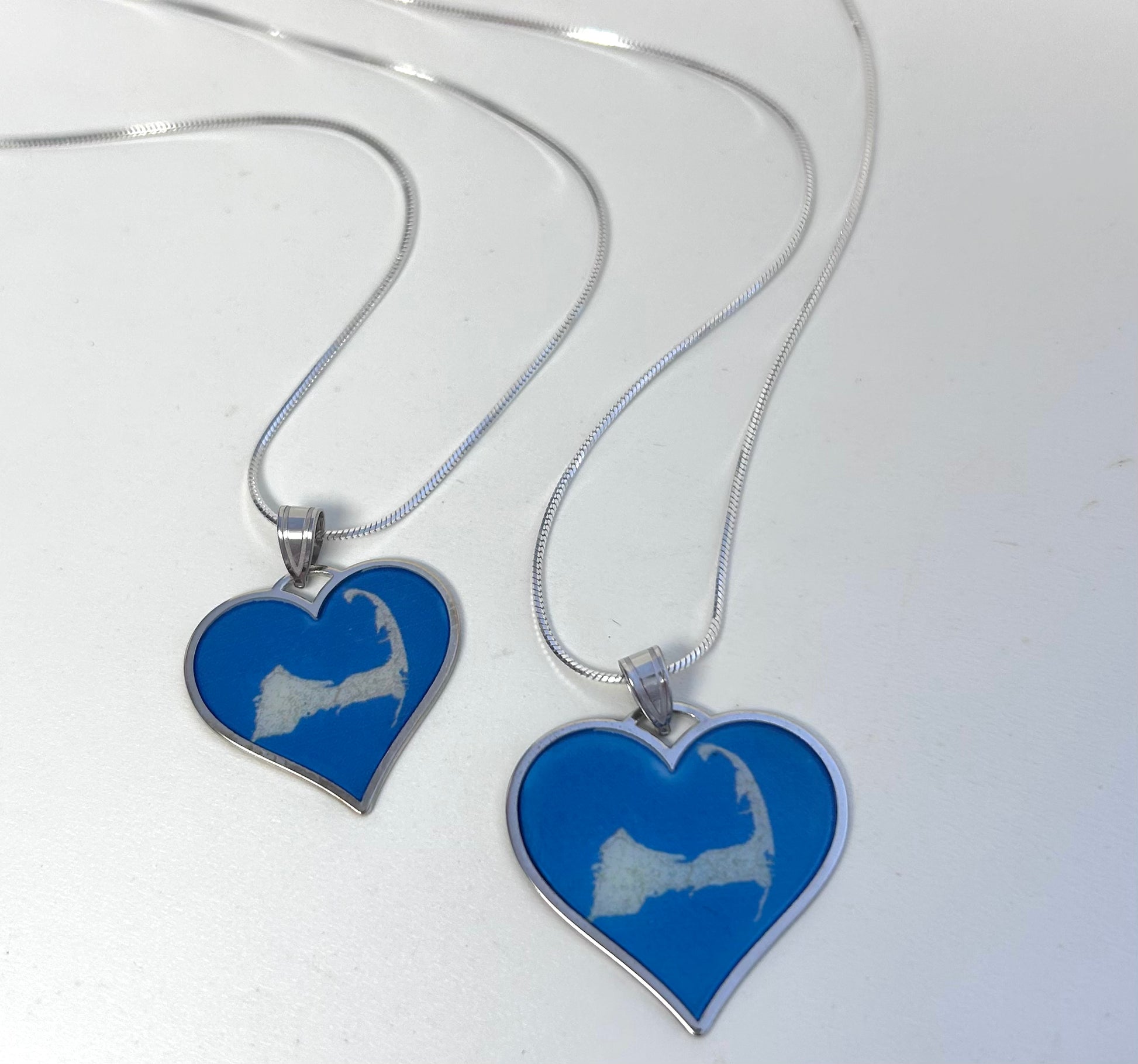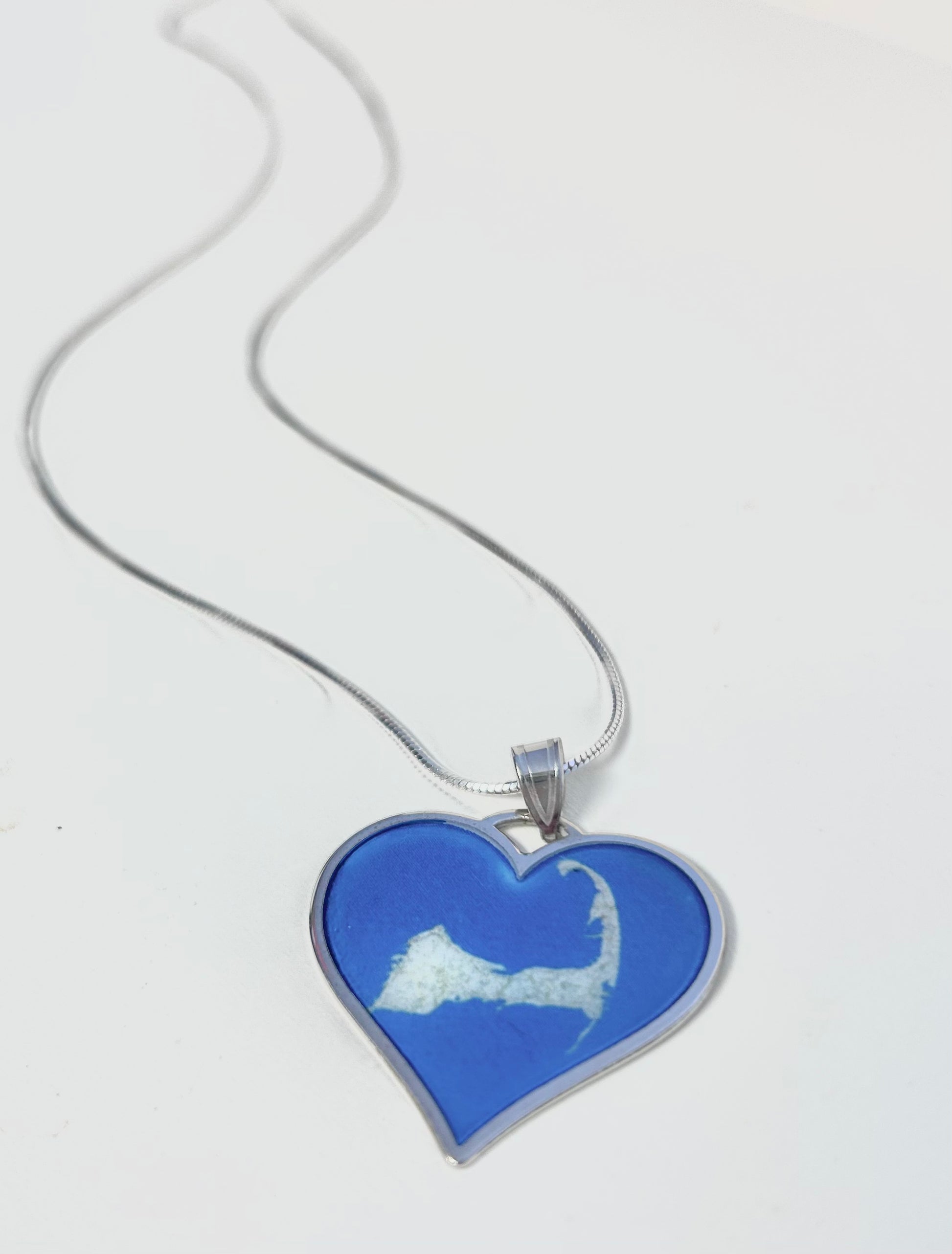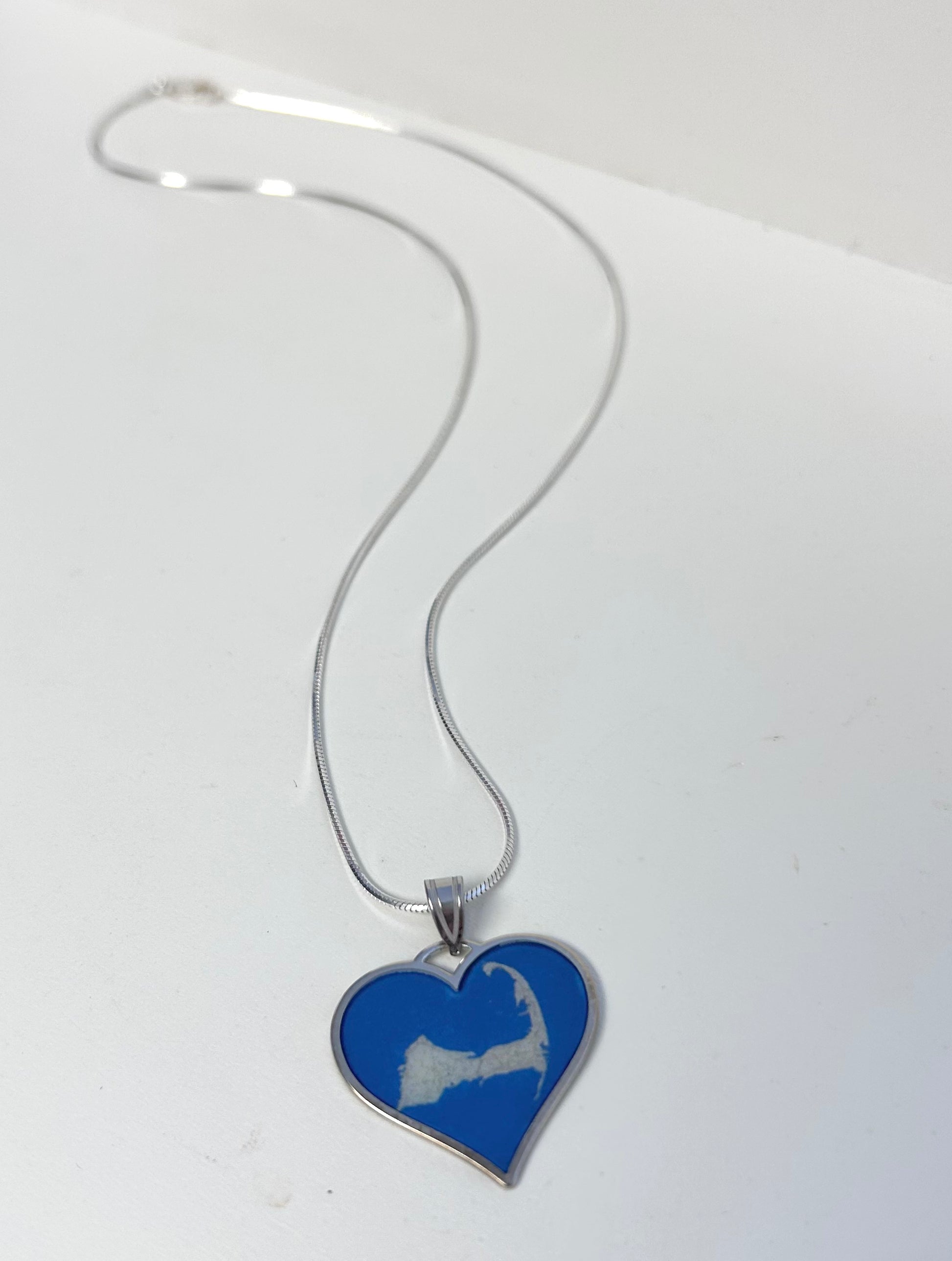 For the girl who's heart belongs on Cape Cod. . . this beautiful sterling silver heart is designed in our Cape Cod studio. A pretty nantucket blue background perfectly complements the map of the Cape. Accompanied by an 18" sterling silver snake chain which adds a lovely sparkle to the finished look.