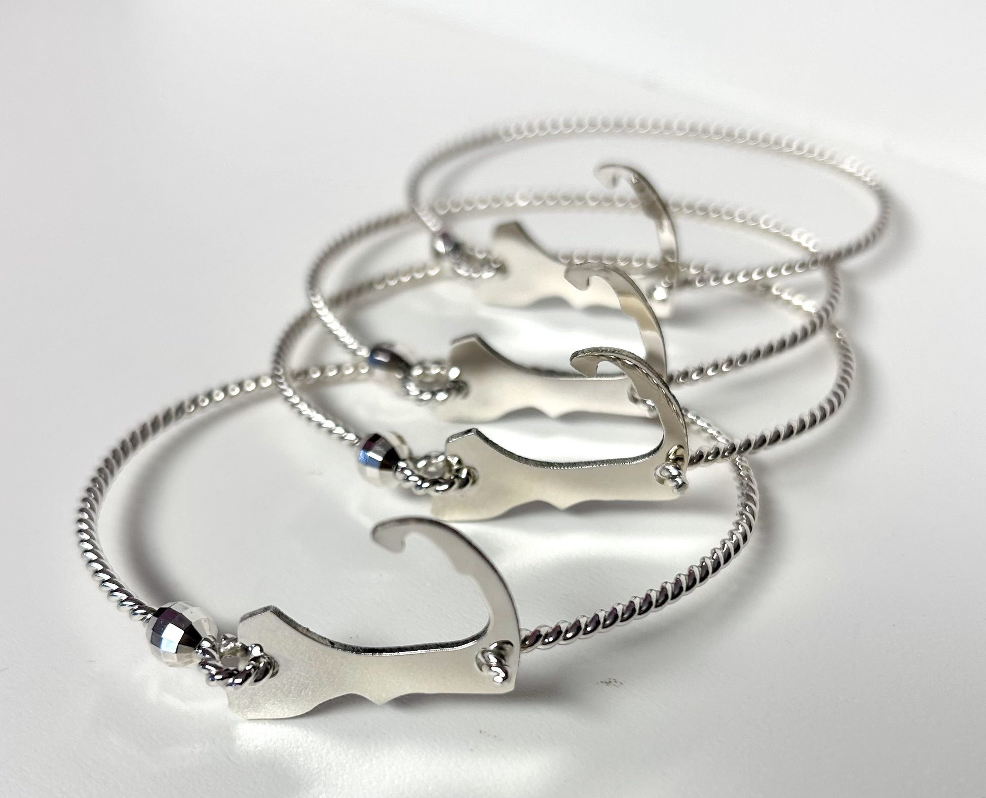 This one is for the Cape Cod Girl! Beautifully hand crafted in solid sterling silver, our pretty Cape Cod map is polished to a high shine and paired with a sterling silver rope style bangle bracelet and finished with a sparkle accent bead. Made to enjoy daily and worn alongside other bracelets or worn alone. This piece will surely become an everyday favorite and perfect reminder of your favorite Cape Cod destination.