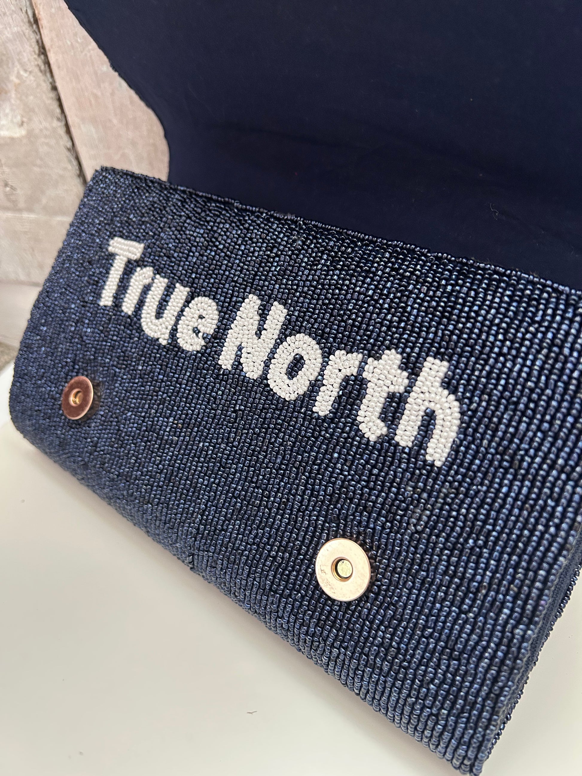 Find your True North with this exquisitely beaded handbag. This beautiful bag features all over beading and a fold over snap top that when opened reveals the True North, a reminder to always stay on course. Versatile and just the right size to use as a clutch or a shoulder/crossbody with removable chain. Classically styled in navy blue with creamy white accents it’s the perfect accessory for any nautical girl!