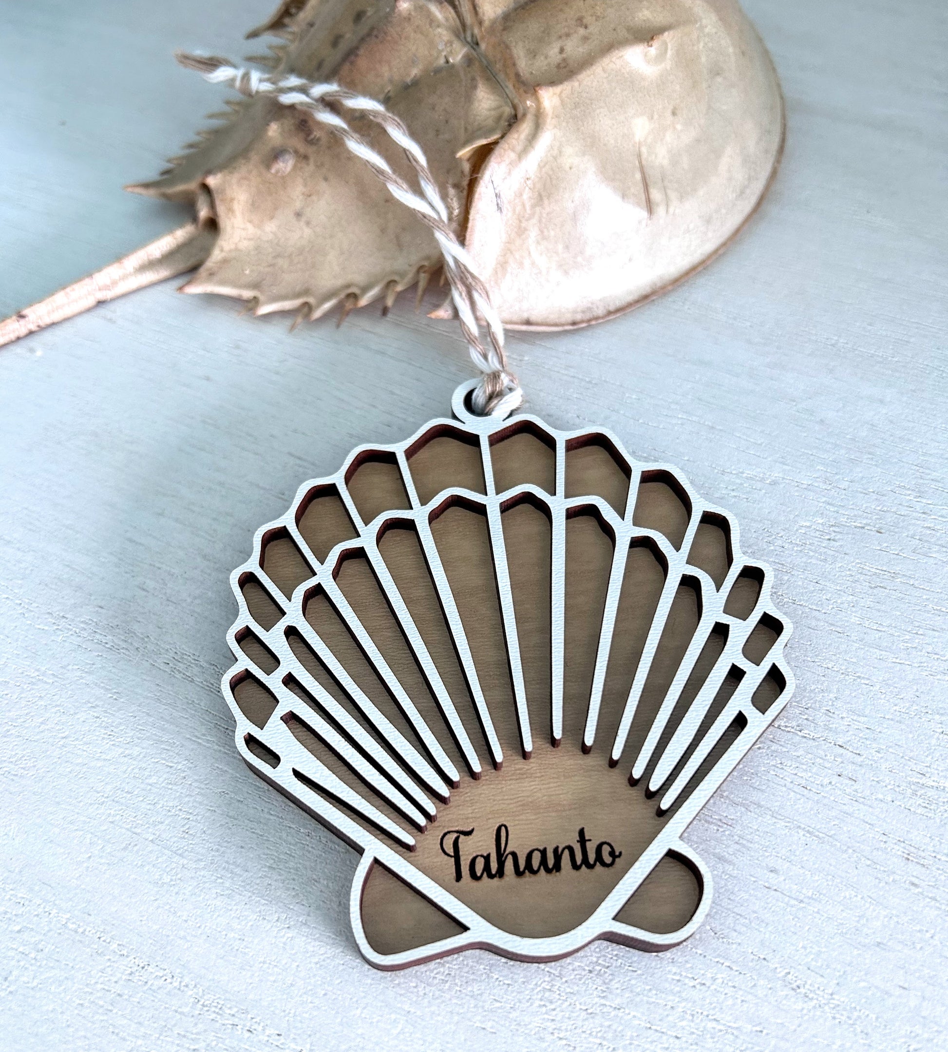 A pretty laser cut wood scallop shell ornament, highlighted with white accents and etched with "Tahanto" a beautiful beach neighborhood in the Town of Bourne, on Cape cod, Ma!