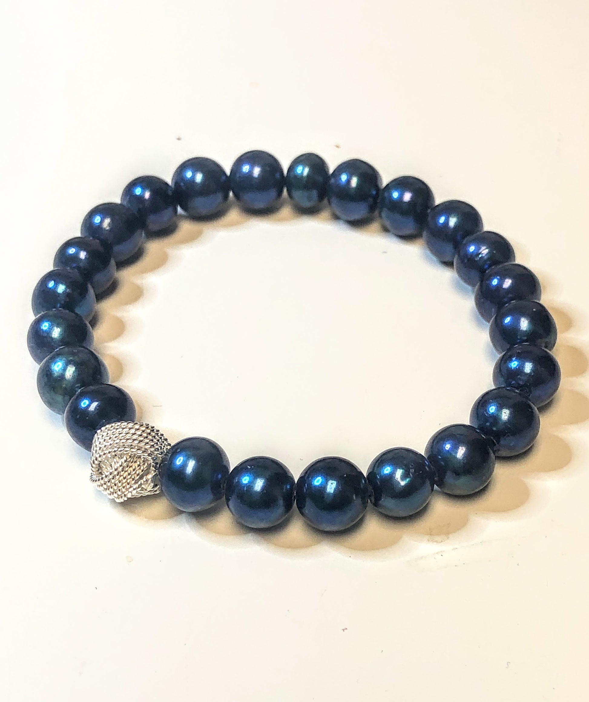 A classic nautical bracelet! Our pretty sterling silver knot is beautifully paired with stunning navy blue freshwater pearls and hand strung on super strong stretch cord for easy on/off wear. The perfect addition to any bracelet pile, bridesmaid gifts, or something blue, for the bride to be.
