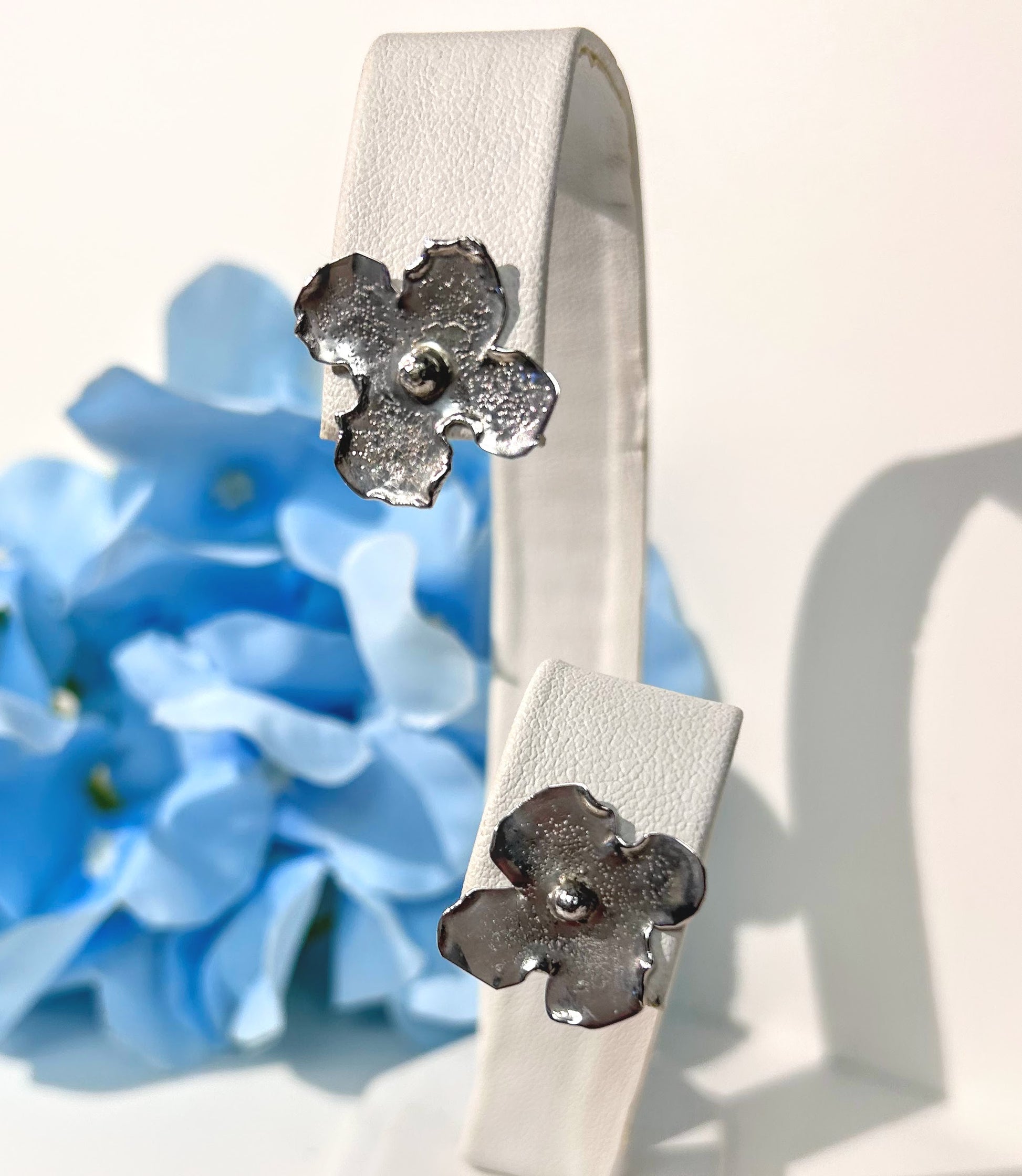 Two unique Hydrangea flowers hand crafted in sterling silver, each about the size of a quarter, these pretty earrings are perfect for everyday wear and will go from day to night flawlessly. Each posted with heavy sterling silver push backs. A beautiful earring for your collection!
