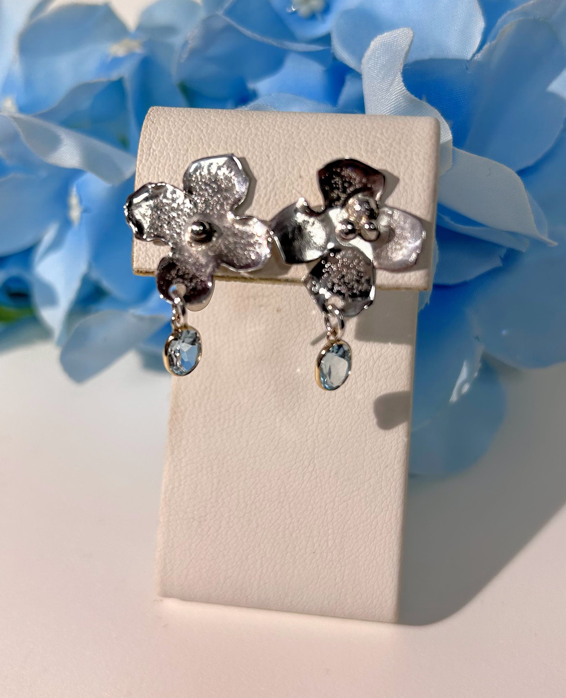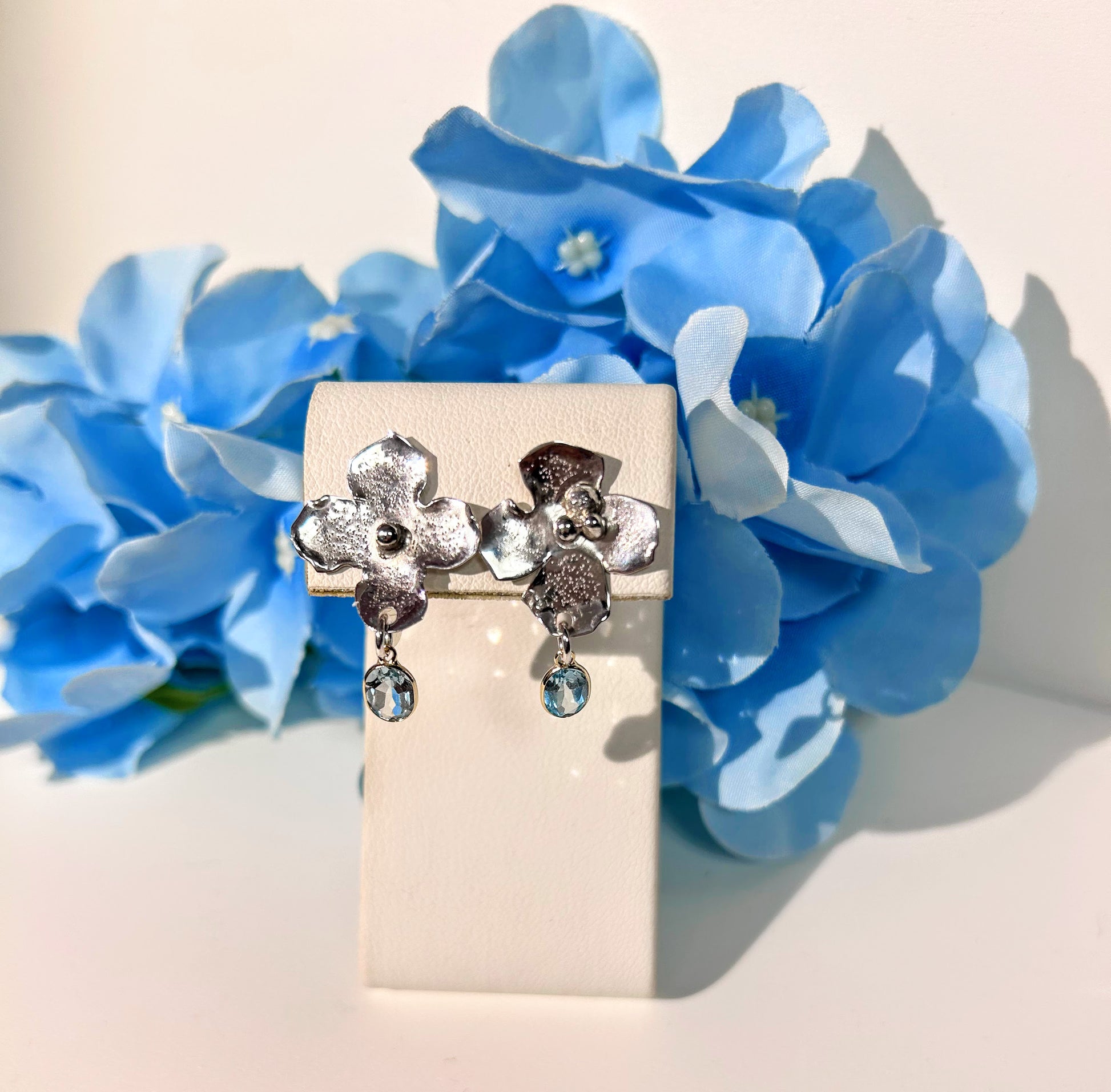 Two unique Hydrangea flowers hand crafted in sterling silver, each with a sky blue topaz set in 14kt gold bezels dangling perfectly. About the size of a quarter, these pretty earrings are perfect for everyday wear and will go from day to night flawlessly. Each posted with heavy sterling silver push backs. A beautiful earring for your collection!