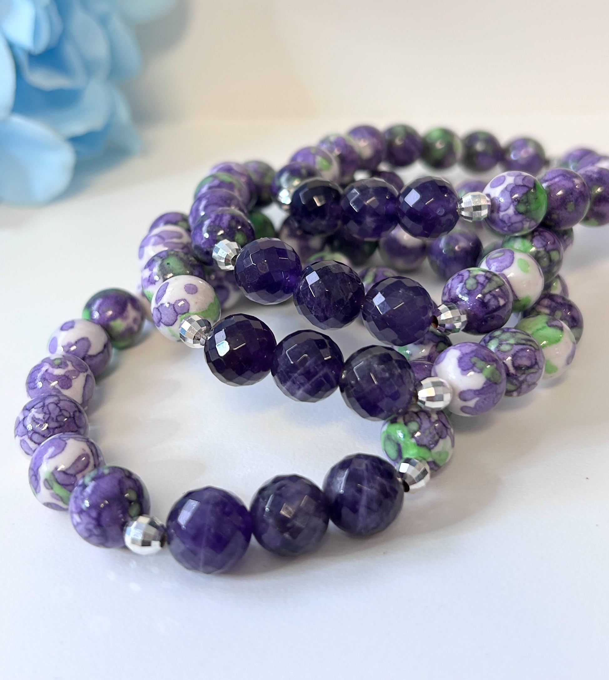 A pretty pop of color! We created these pretty Hydrangea flower Jade Gemstone bracelets as accents to wear along with our Hydrangea Collection. A special piece thats hand strung on super strong stretch cord with faceted Amethyst Gemstone beads and sterling silver sparkle beads. Wear alone or to compliment other pieces.