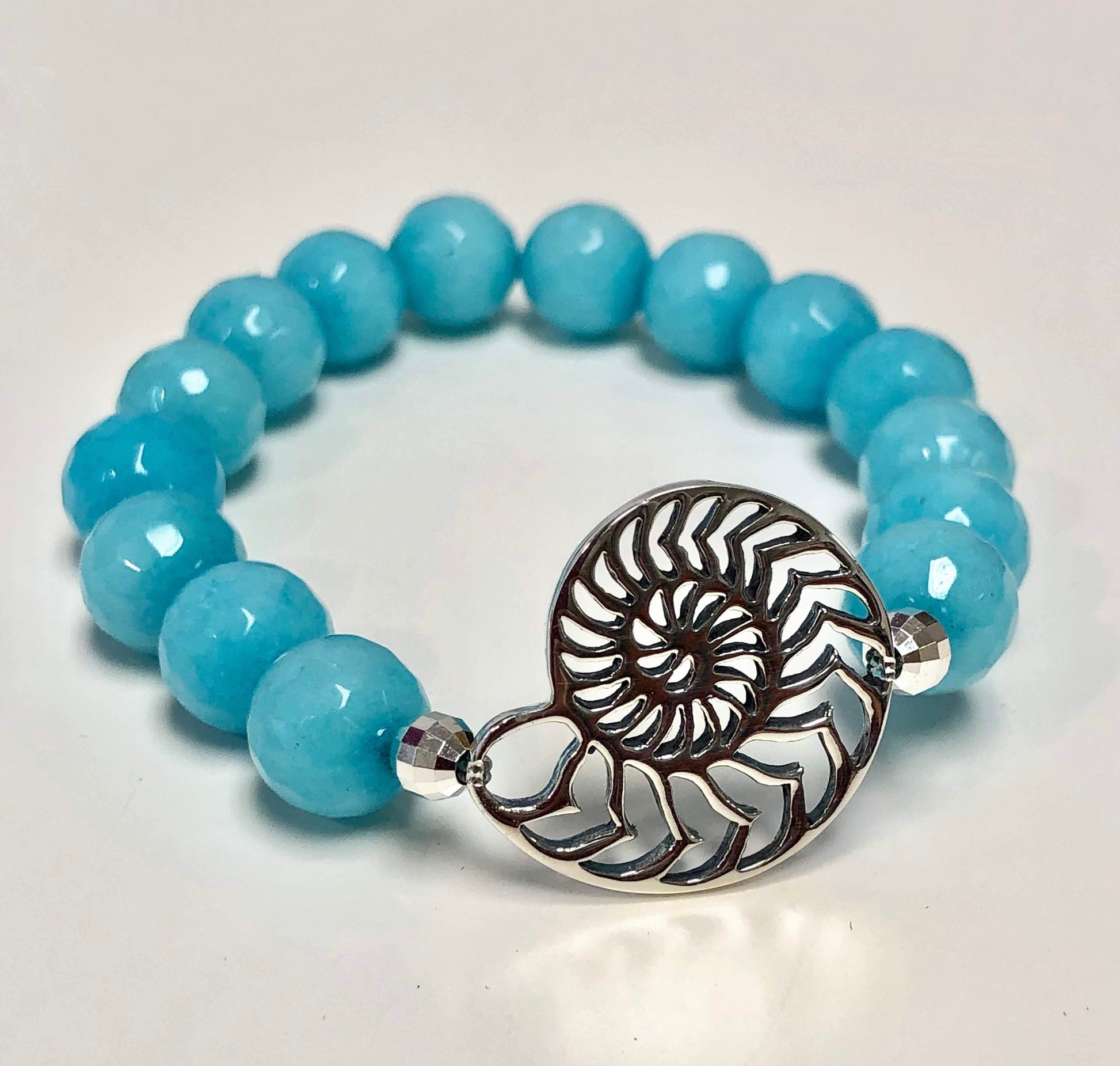 Seashells by the seashore! This elegant sterling silver nautilus shell is beautifully complimented with the prettiest turquoise Agate beads and sparkly sterling silver accents. Hand-strung on SUPER strong stretch cord for easy on/off wear making it the perfect, no fuss piece for everyday wear. A stunning addition to any beach girl's bracelet pile.