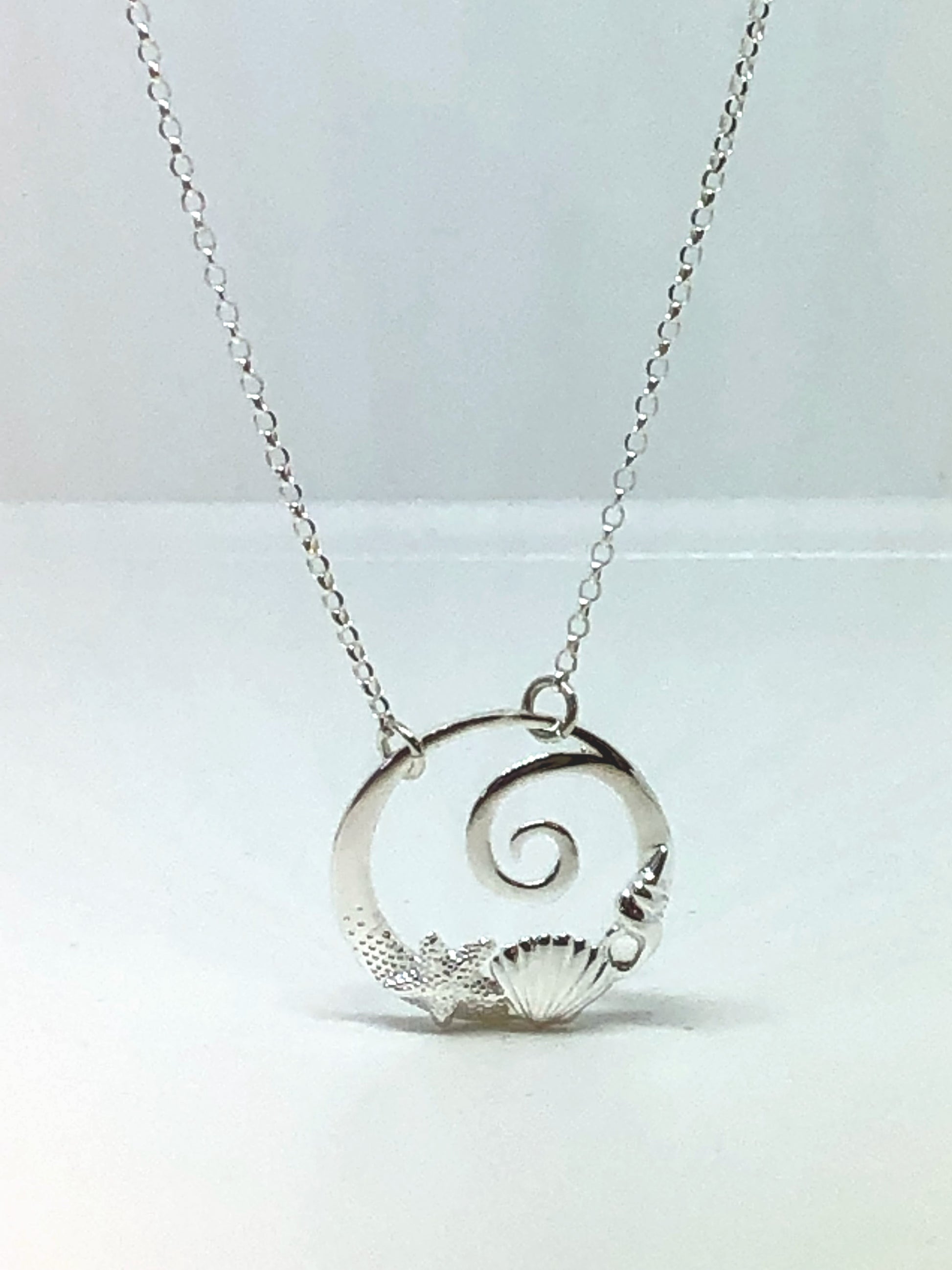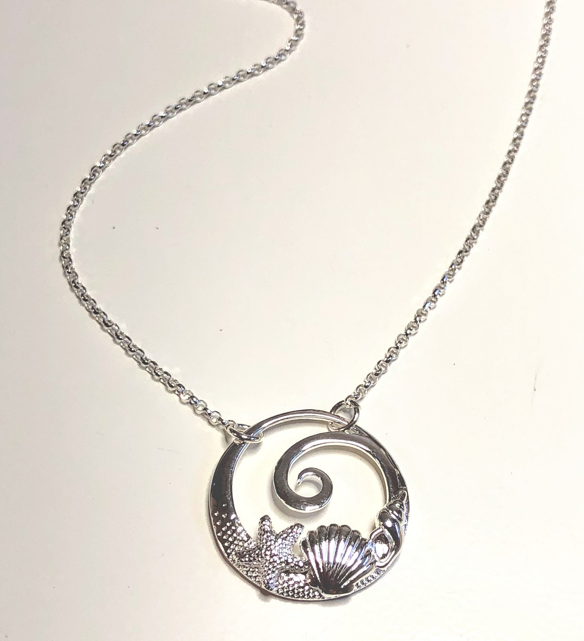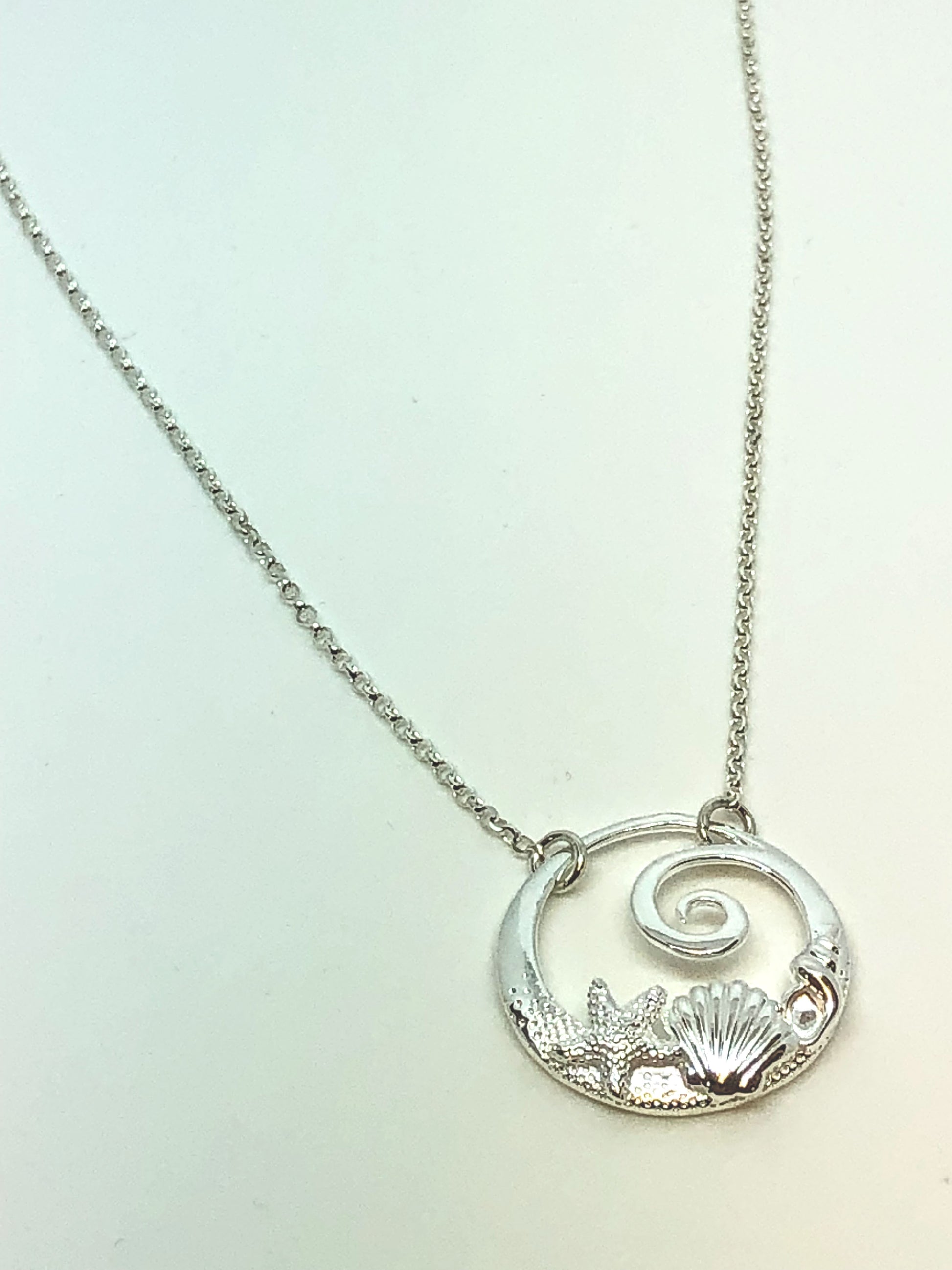 Calling all beachcombers! The perfect addition to your seashell jewelry collection. Crafted in solid sterling silver, tiny seashells dance in the sand as a wave crashes above. A pretty, sterling silver sparkle chain completes this stunning necklace. A beachcombers delight.