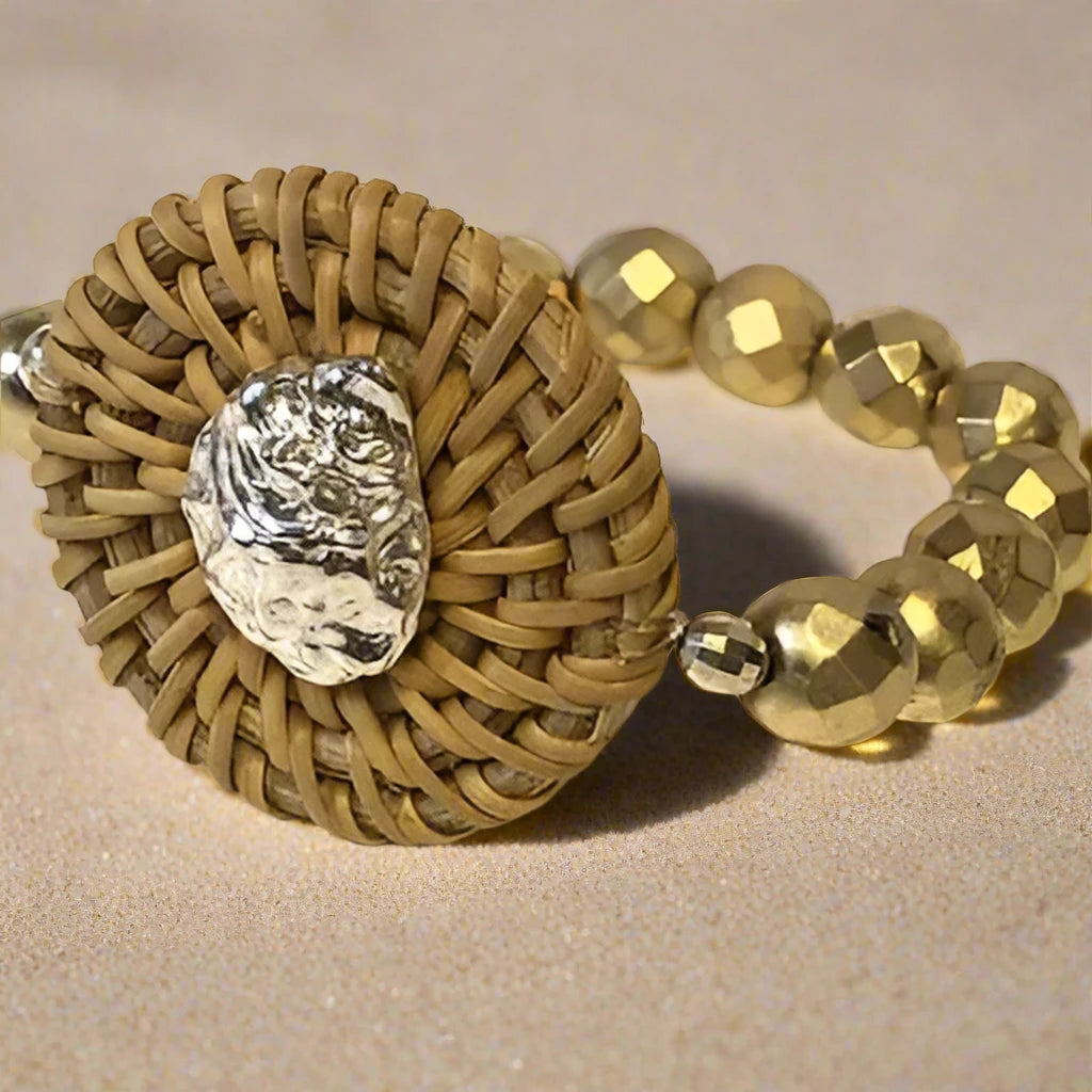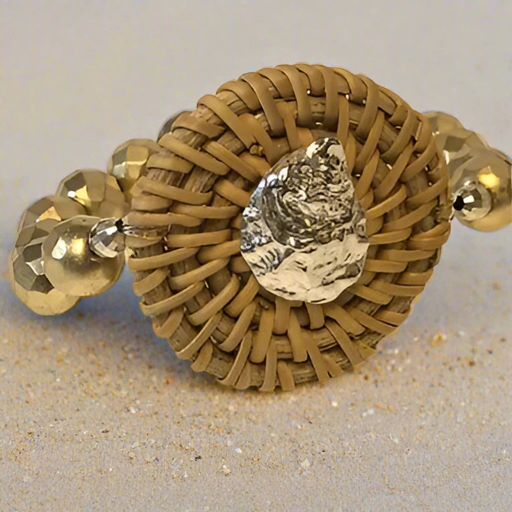 Stunning and unique! Our basket top Oyster Shell gemstone bracelet is reminiscent of the Nantucket Basket, with an updated twist. Traditional basket weave rattan base is designed with a sterling silver Oyster Shell top and hand strung with stunning Gold Hematite gemstone beads and sparkly sterling silver accents. A beautiful blend of classic and contemporary. Perfect styled with casual beach wear, a sweet sundress or a high fashion resort wear.
