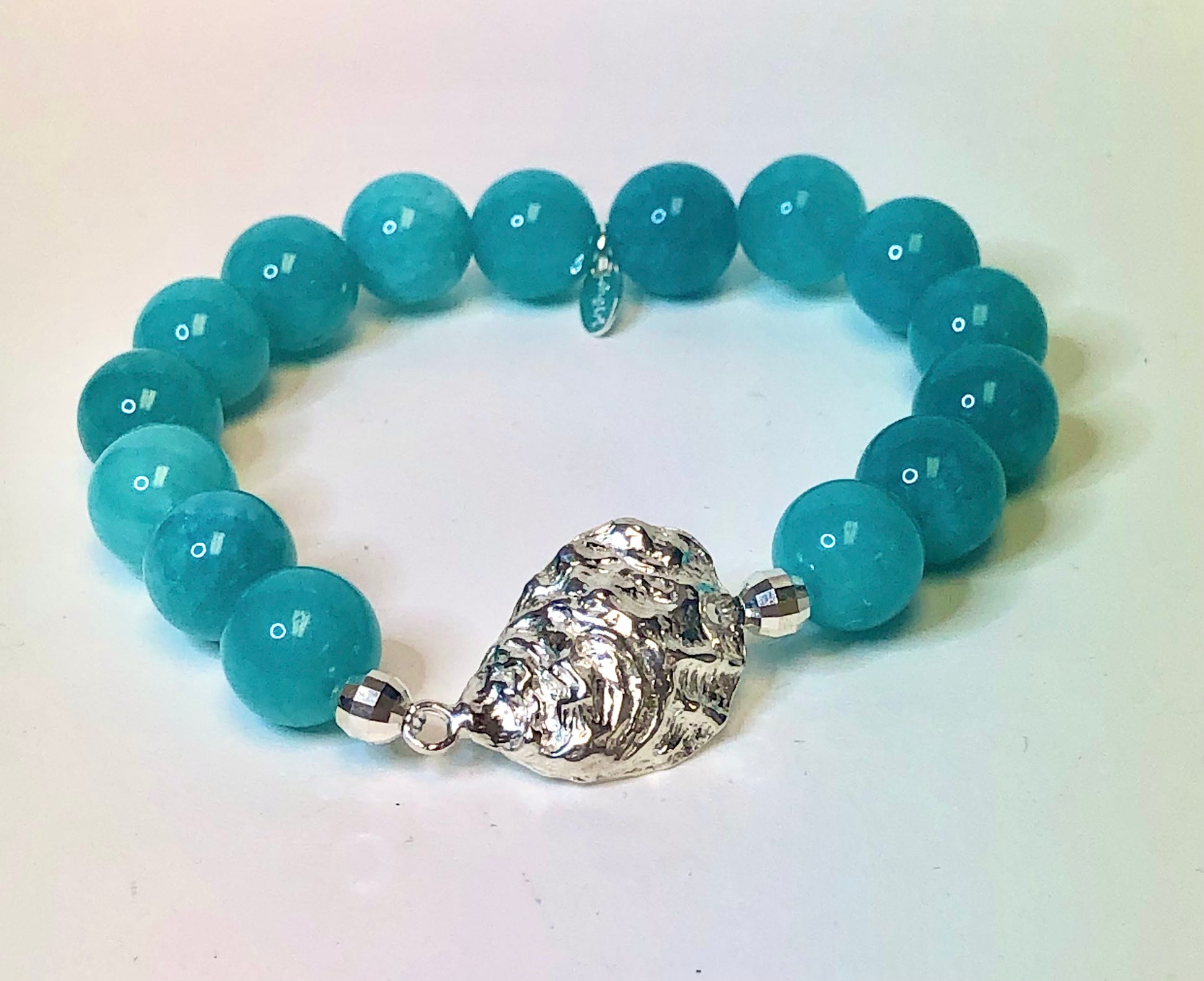 A beautifully detailed sterling silver oyster shell paired with stunning Teal Jade gemstone beads. Hand strung on super strong stretch cord for easy on/off everyday wear and finished with a sterling silver accent beads. The perfect piece for any beach girl.