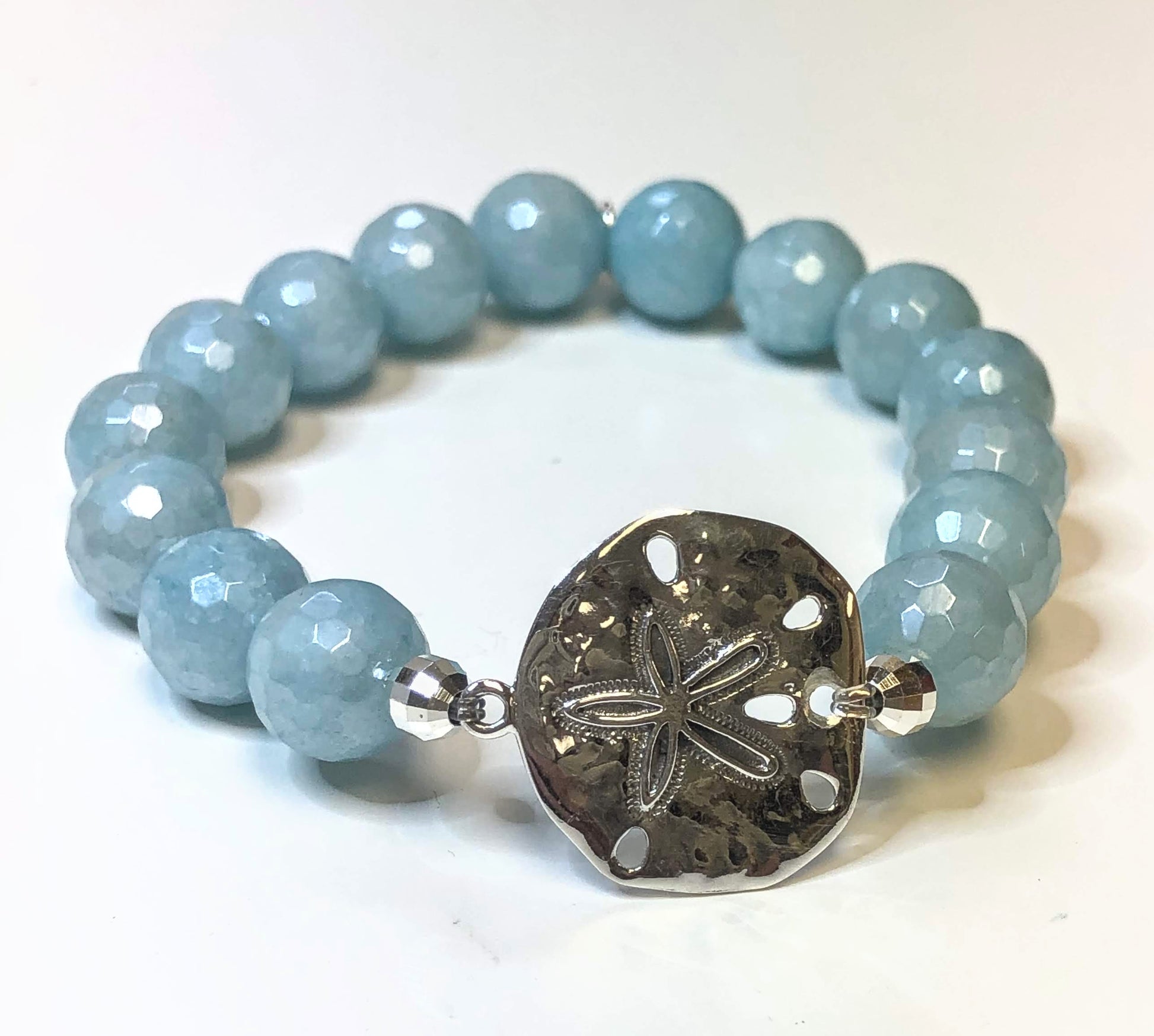 Our stunning Sand Dollar, cast in solid sterling silver is paired with beautiful, beachy Chalcedony gemstone beads and hand strung on super-strong stretch cord. An easy slip on/off style is accented with sterling silver beads, a classic nautical bracelet, meant to be worn day and night. The perfect bracelet for any Beach girl!