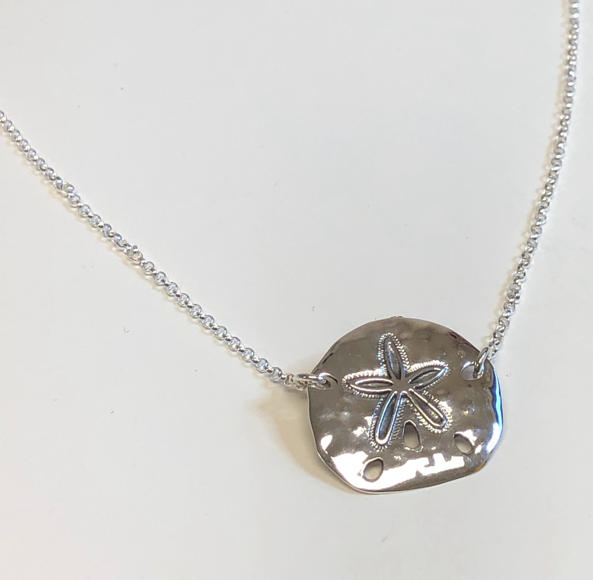 Beautifully detailed sand dollar necklace in solid sterling silver. This beachy and classically styled sand dollar necklace is perfect for any ocean lover! Accented with a sparkly sterling silver chain and meant to wear everyday. Dressed up or casual, this piece is sure to make any beachcomber shine!