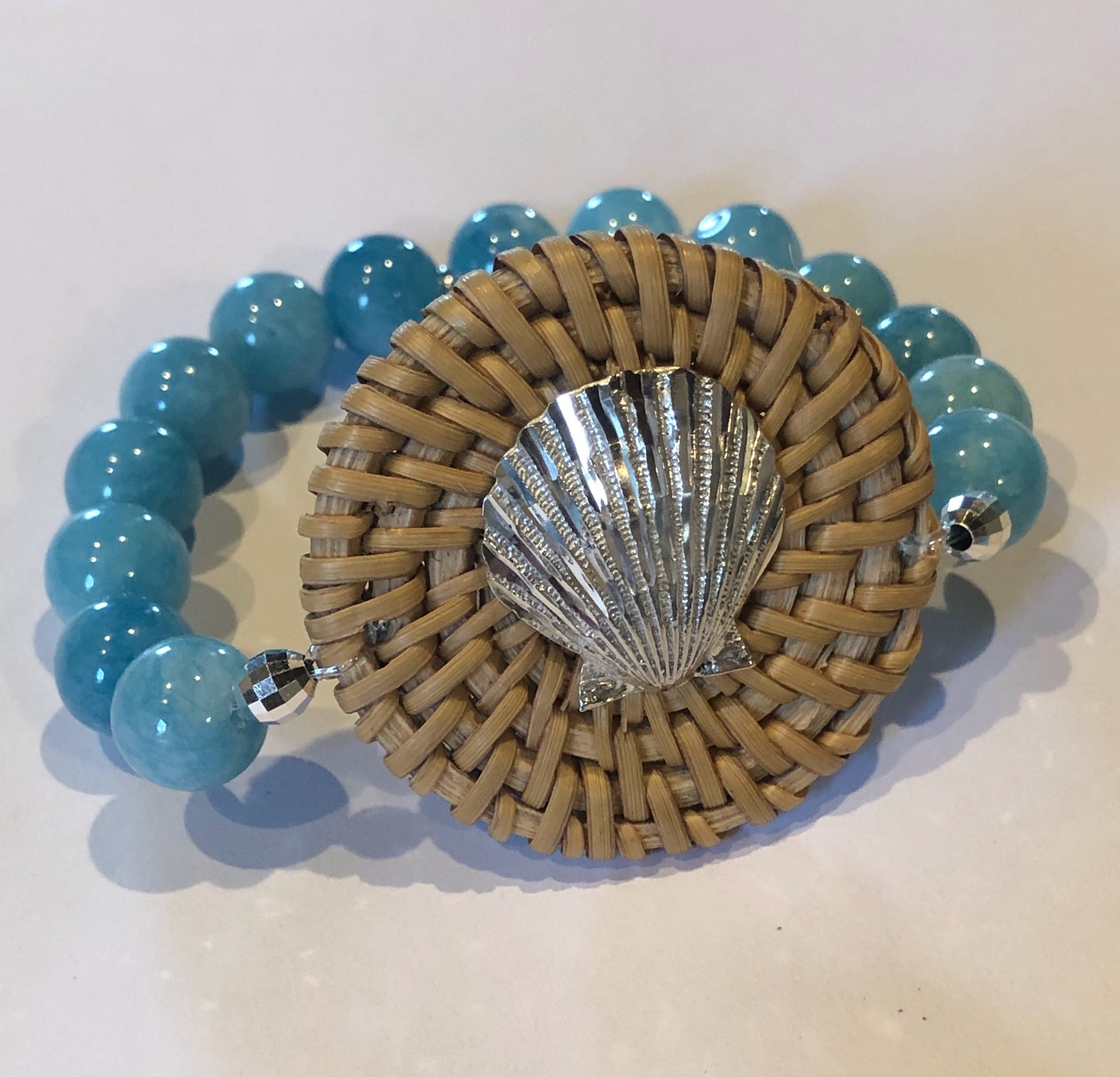 Stunning and unique! Our basket top Scallop Shell gemstone bracelet is reminiscent of the Nantucket Basket, with an updated twist. Traditional basket weave rattan base is designed with a sterling silver Scallop Shell top and hand strung with stunning cornflower blue Agate gemstone beads and sparkly sterling silver accents. A beautiful blend of classic and contemporary. Perfect styled with casual beach wear, a sweet sundress or a high fashion resort wear.