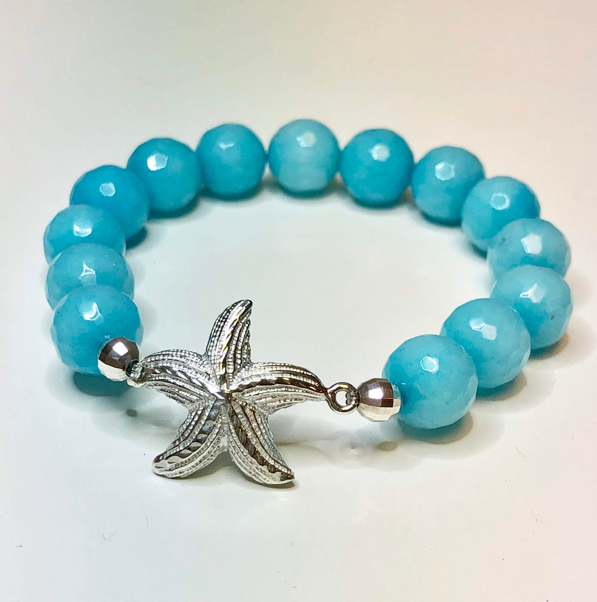 Our pretty Starfish cast in solid sterling silver is paired with beautiful Turquoise Jade gemstone beads and hand strung on super-strong stretch cord. An easy slip on/off style is accented with sterling silver beads, a classic nautical bracelet, meant to be worn day and night. The perfect bracelet for any Beachcomber!