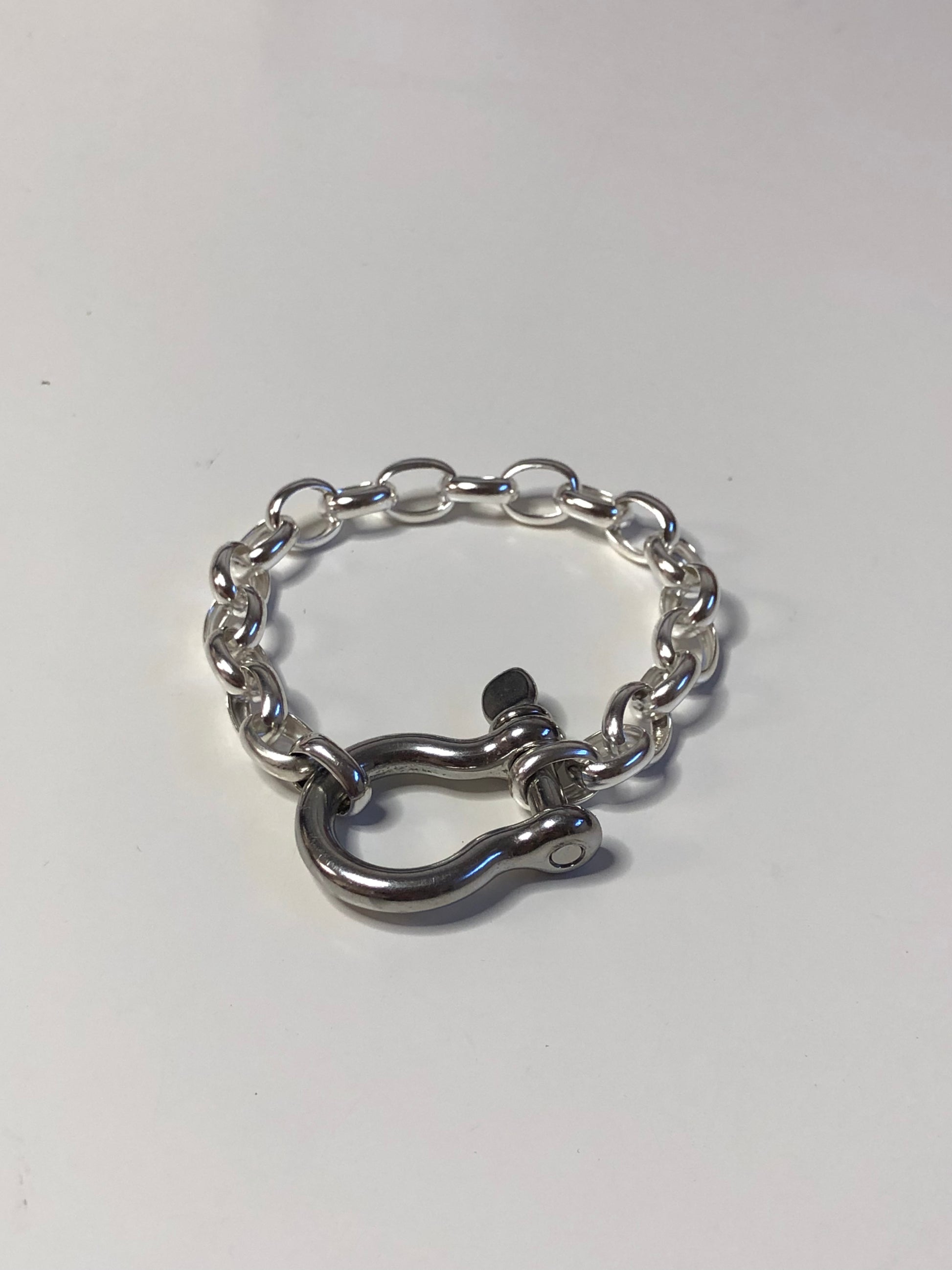 Ahoy! Our Stainless Steel Shackle Clasp is beautifully paired with a Sterling SIlver Anchor chain, for the perfect Nautical look. A classic styled sterling silver anchor link bracelet with a stainless steel anchor shackle clasp. Yes, the real shackle that connects the anchor chain to the anchor. A beautiful piece to clip charms to or wear alone as your favorite bracelet! Shown with matching shackle necklace, sold seperately