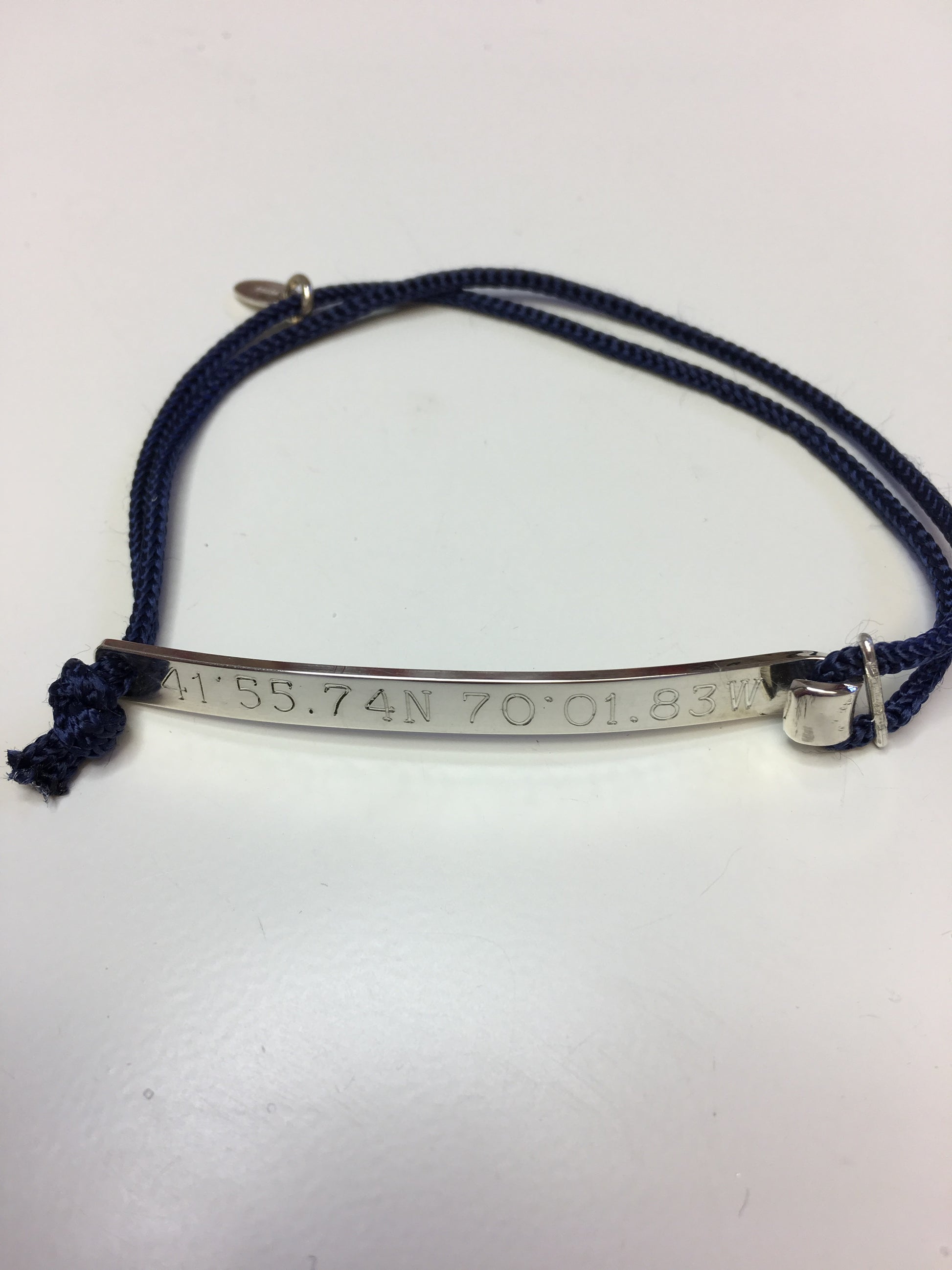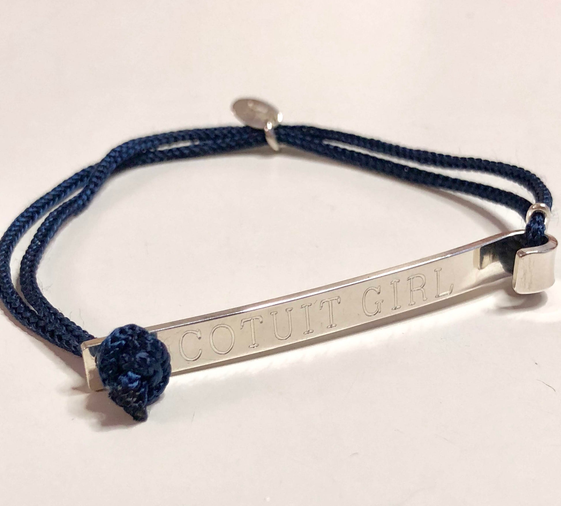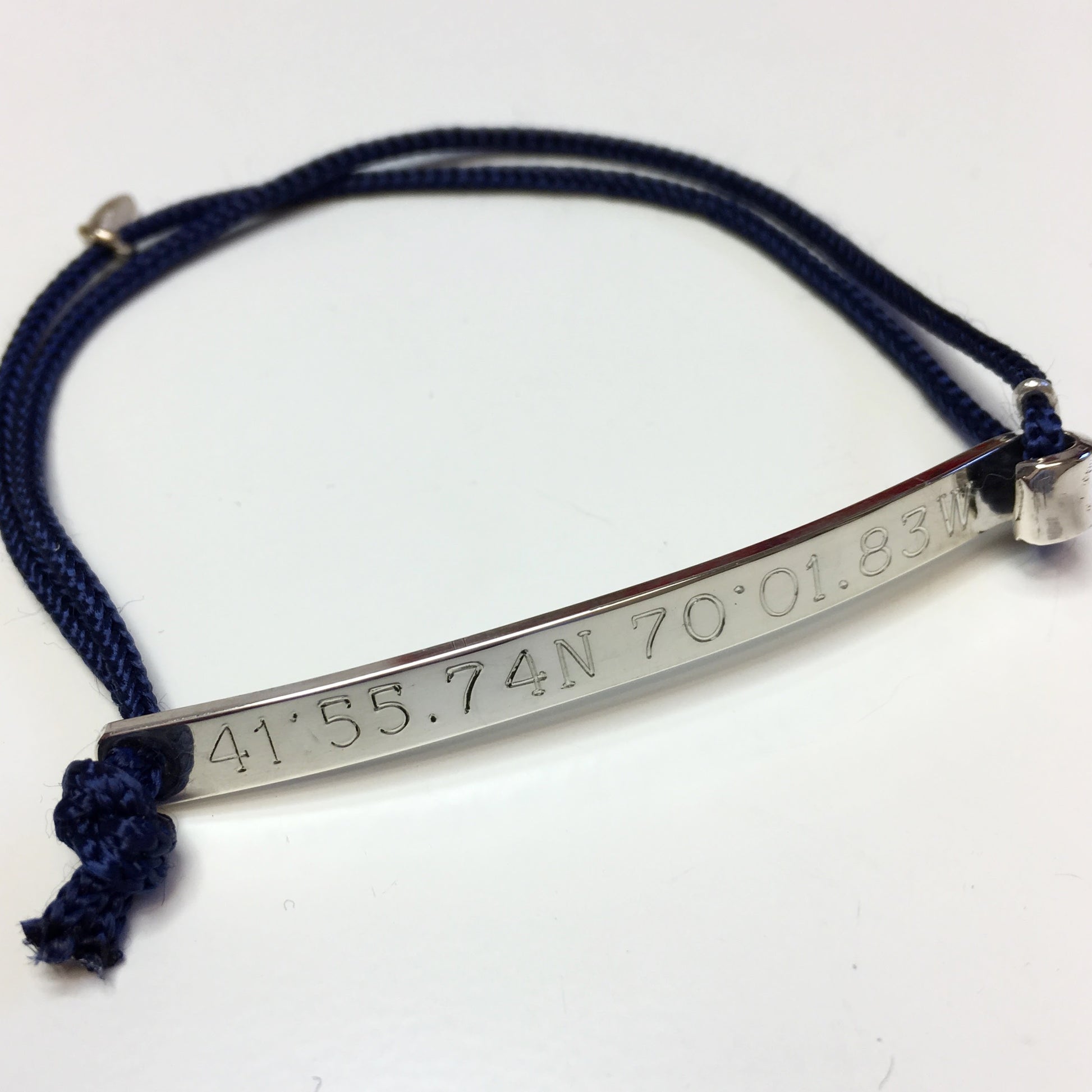 Our beautiful handcrafted Beach Booty Cord Bracelet made with our solid sterling silver custom engraved plate and accented with a navy blue cord with sterling silver accents. Made to accommodate your custom engraving, get creative with coordinates of your favorite vacation spot, wedding location, first house, college town...the possibilities are yours. Or keep it simple with names like Beach Girl, Ocean Girl, Lake Girl, etc., polished to perfection and sized* to fit most ladies wrists. You name it, We'll Tag it!