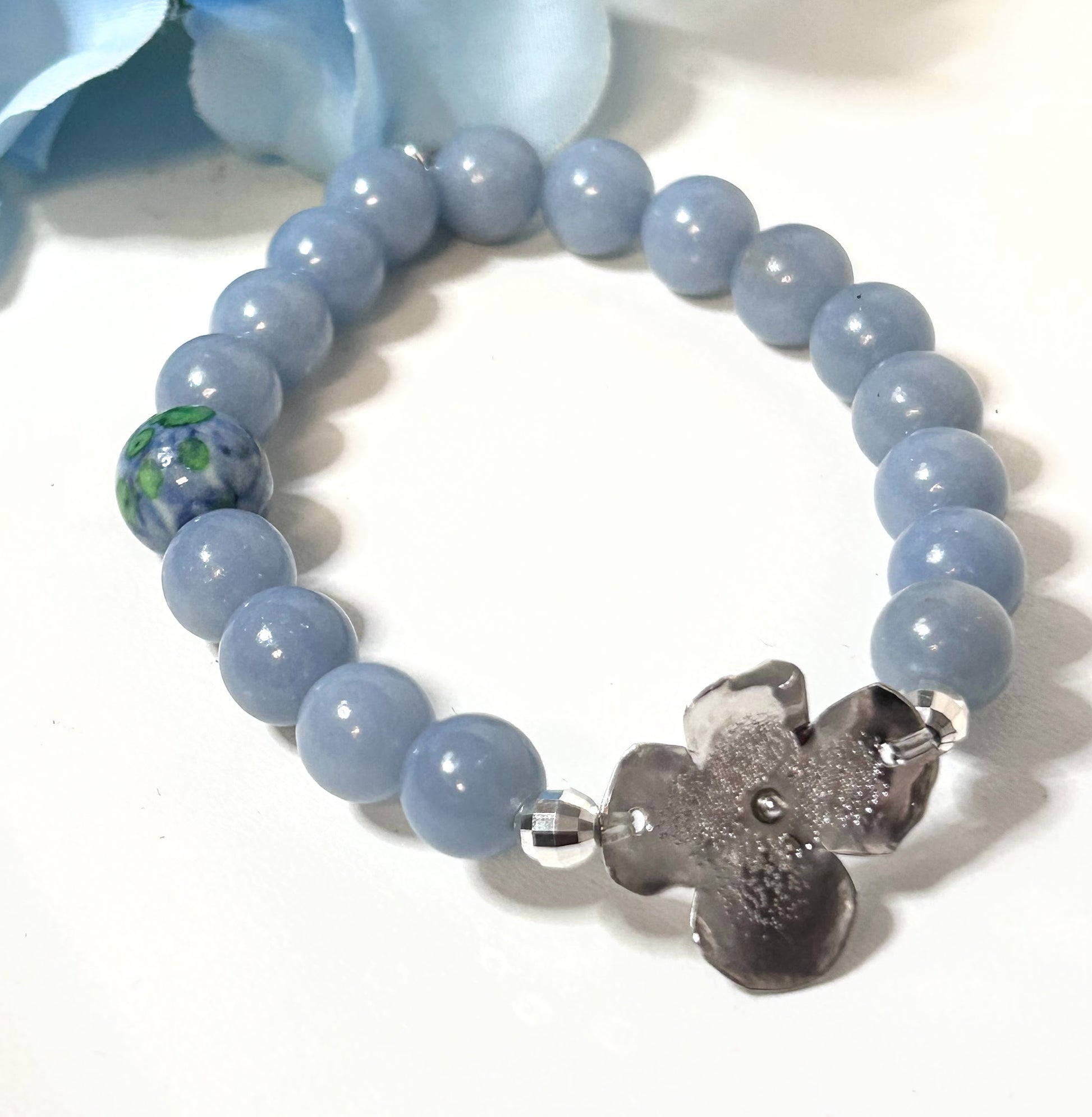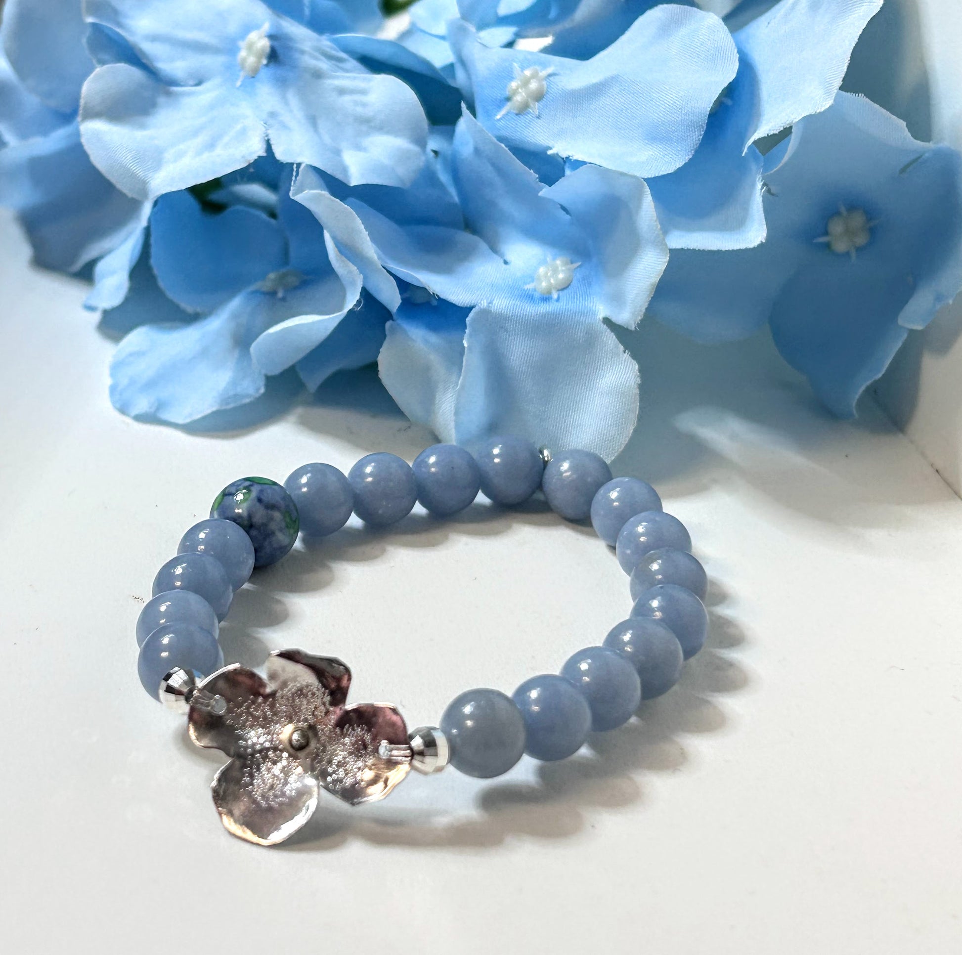 Our pretty one of a kind Hydrangea Blossom is handcrafted in solid sterling silver, strung on super strong stretch cord for easy on/off wear. Pretty blue Angelite gemstone beads, accented with a jade hydrangea flower bead. Sterling silver sparkle beads complete this pretty piece.