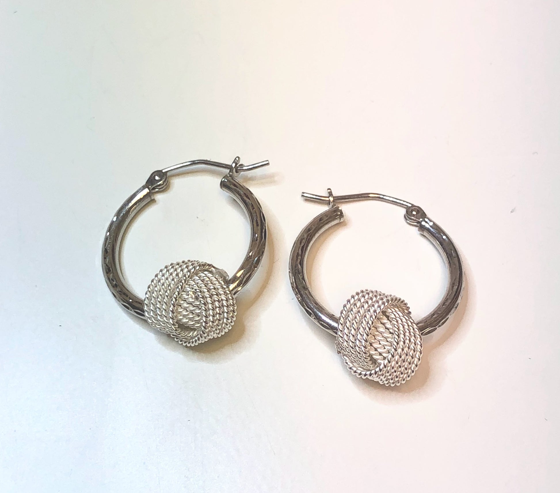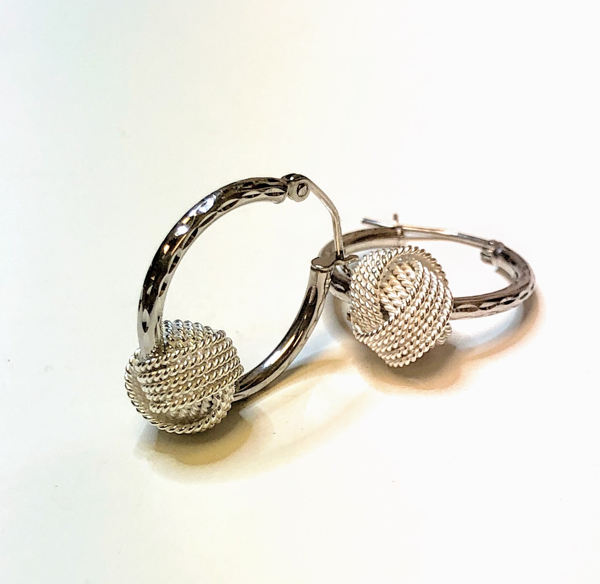 These beautiful sterling silver knot hoops are handcrafted with a stunning light weight sparkle click hinge hoop adorned with a pretty sterling silver woven knot. A customer favorite and a sparkly addition to your Nautical Jewelry Collection!