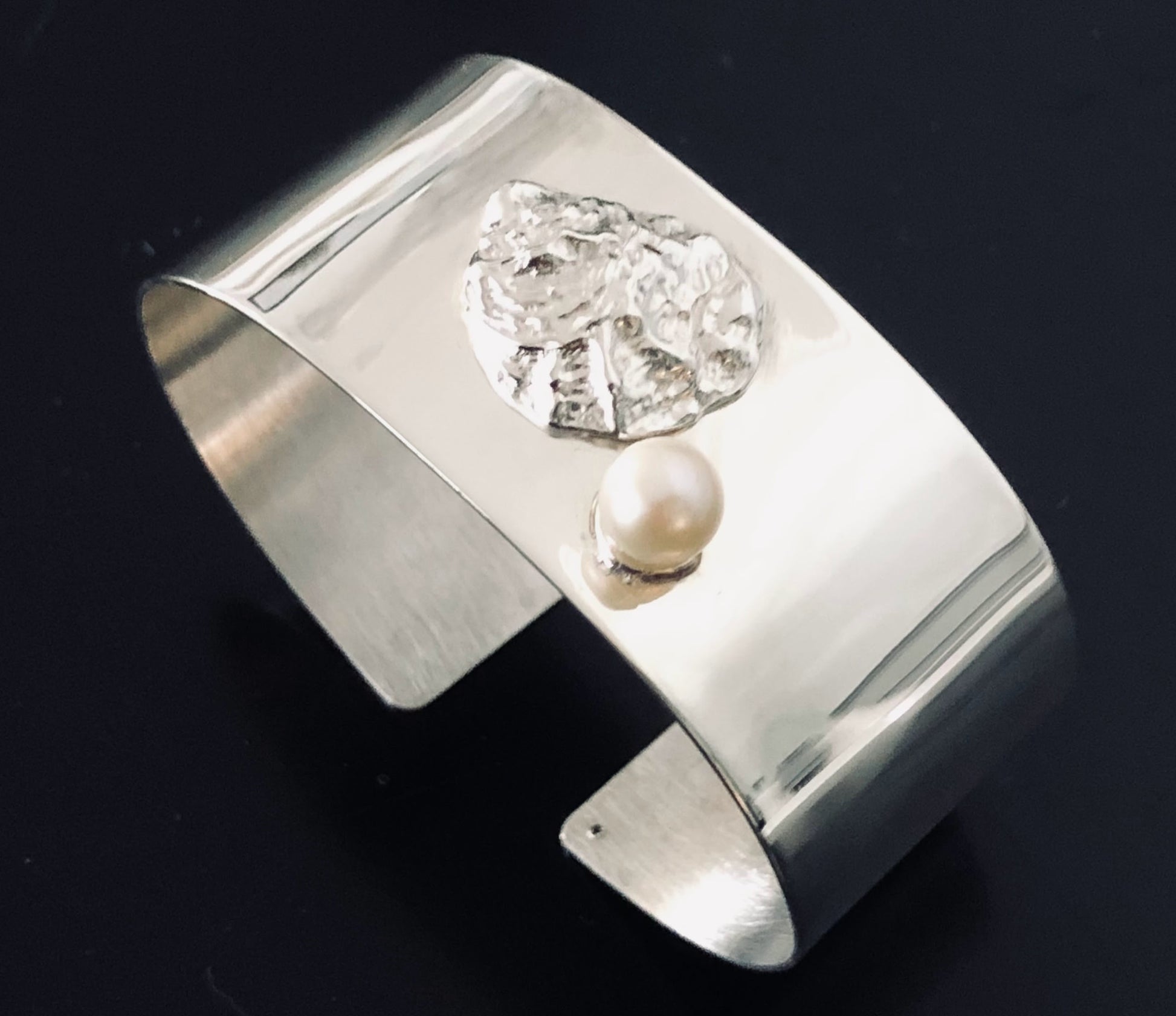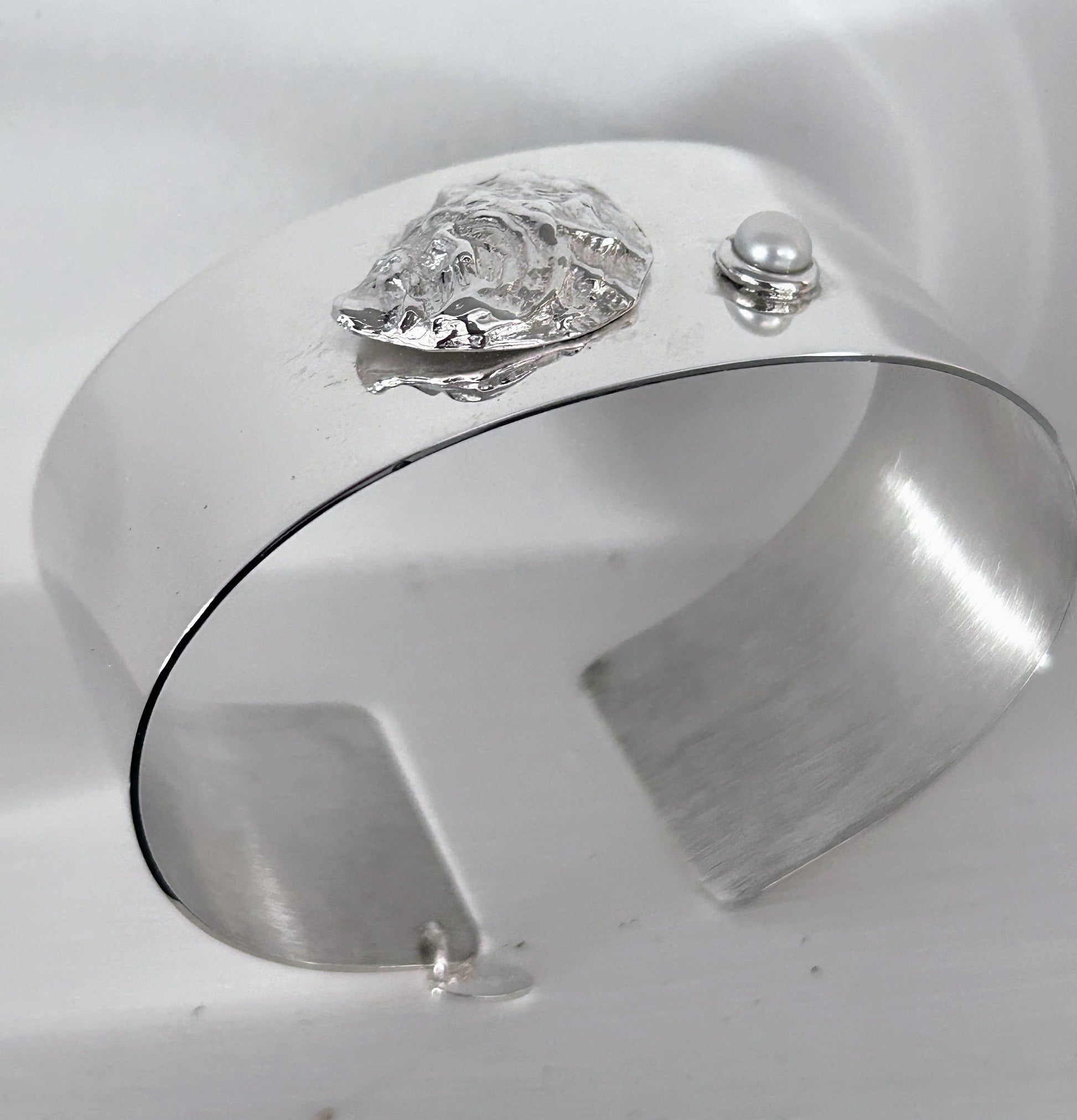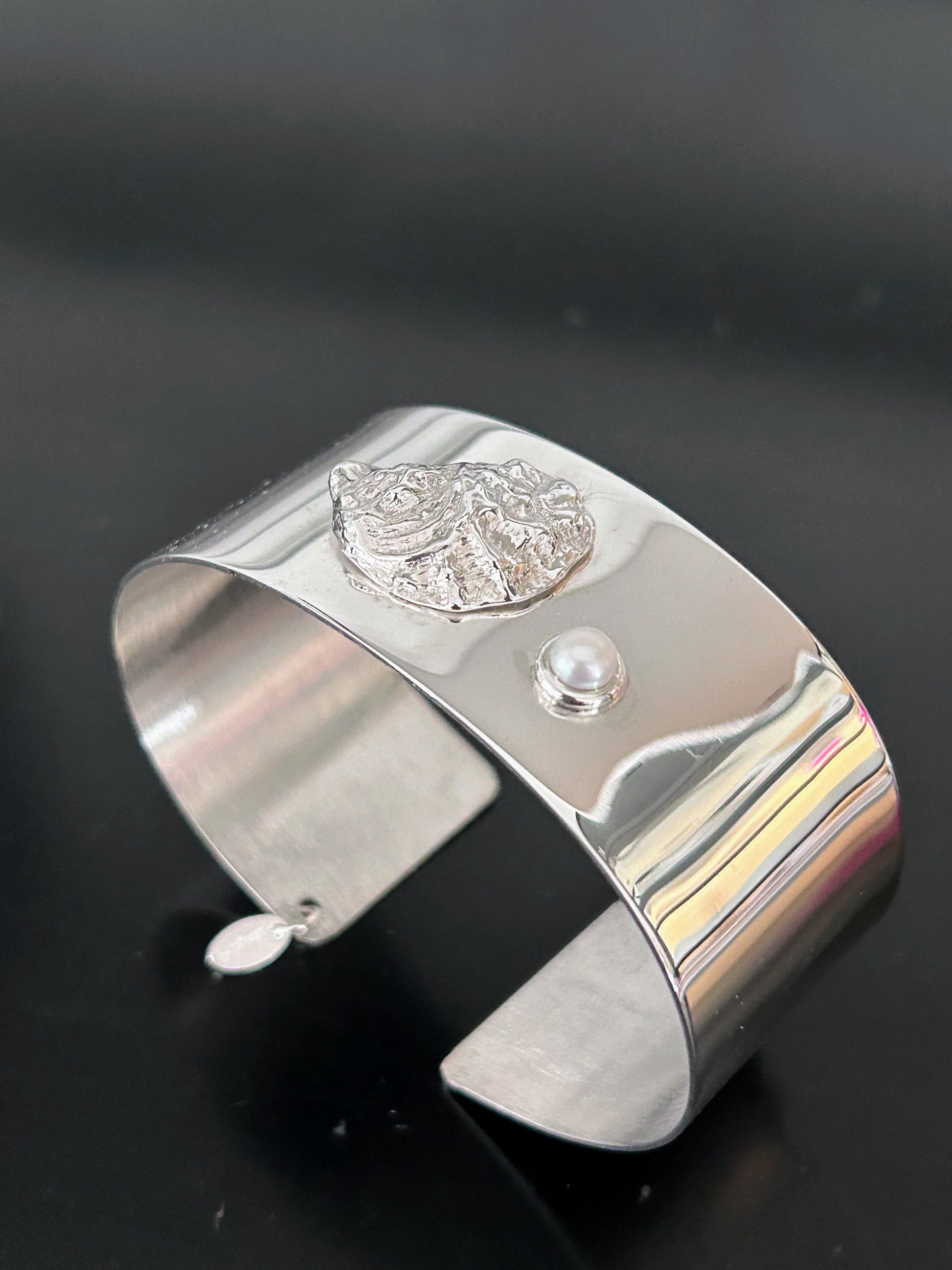 GRIT GETS THE PEARL! Handcrafted in solid sterling silver and accented with a pretty freshwater pearl, pegged and bezel set for ultimate protection against wear. Our beautifully detailed Sterling Silver Oyster Shell sits atop a high polished cuff style bangle creating a comfortable on/off style for daily wear . Designed and handcrafted in our Cape Cod studio. This beautiful piece is sure to turn heads. Perfect for any beachcomber. One size fits most. We are happy to accommodate special sizing requests, please message us at check out and we will happily respond.