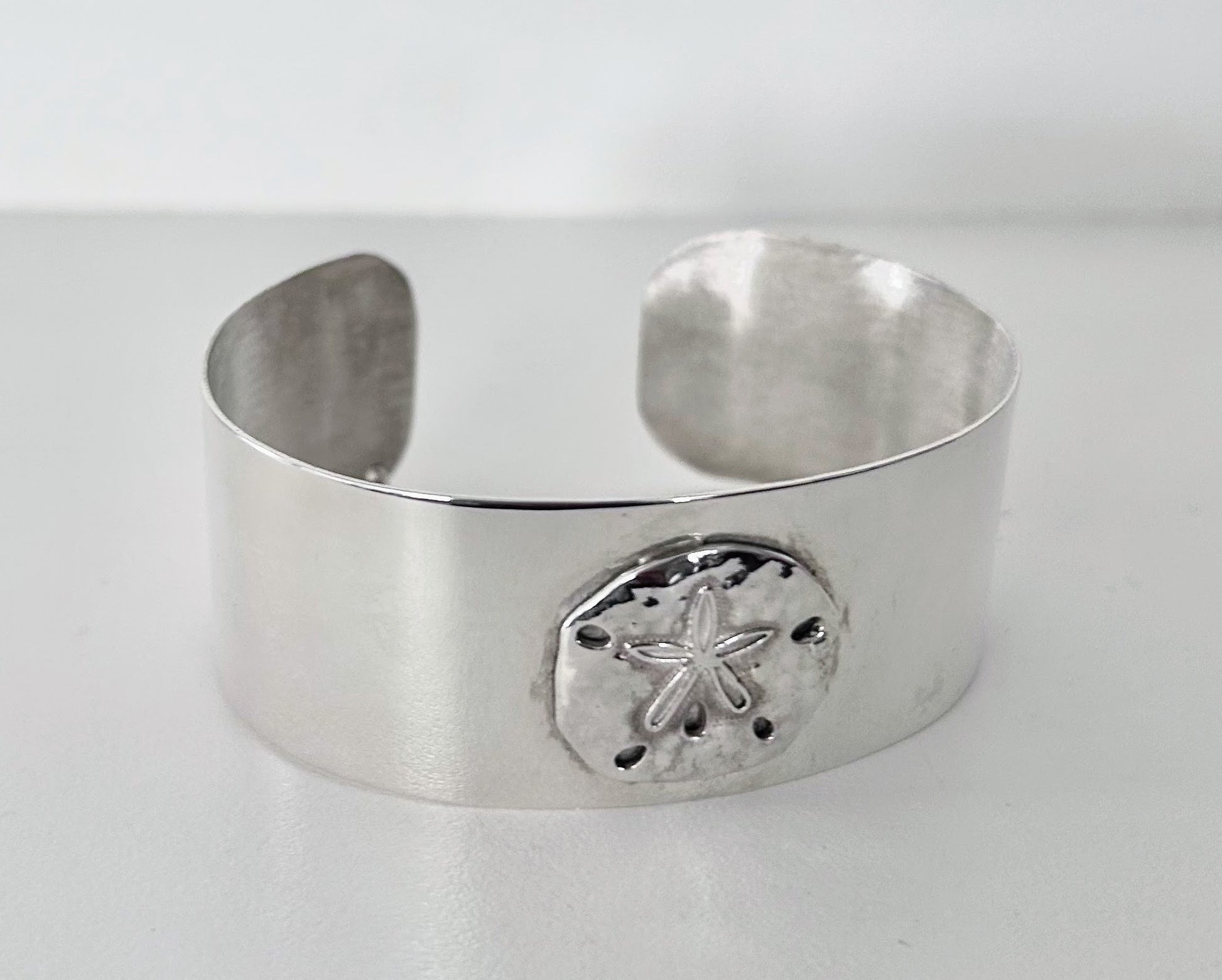 STUNNING! is all that can be said about this unique cuff bracelet. Handcrafted in solid sterling silver, a beautifully detailed Sand Dollar sits atop a high polished cuff style bangle, a comfortable on/off style. Designed and handcrafted in our Cape Cod studio. This beautiful piece is sure to turn heads. Perfect for any beachcomber. One size fits most. We are happy to accommodate special sizing requests, please message us at check out and we will happily respond.