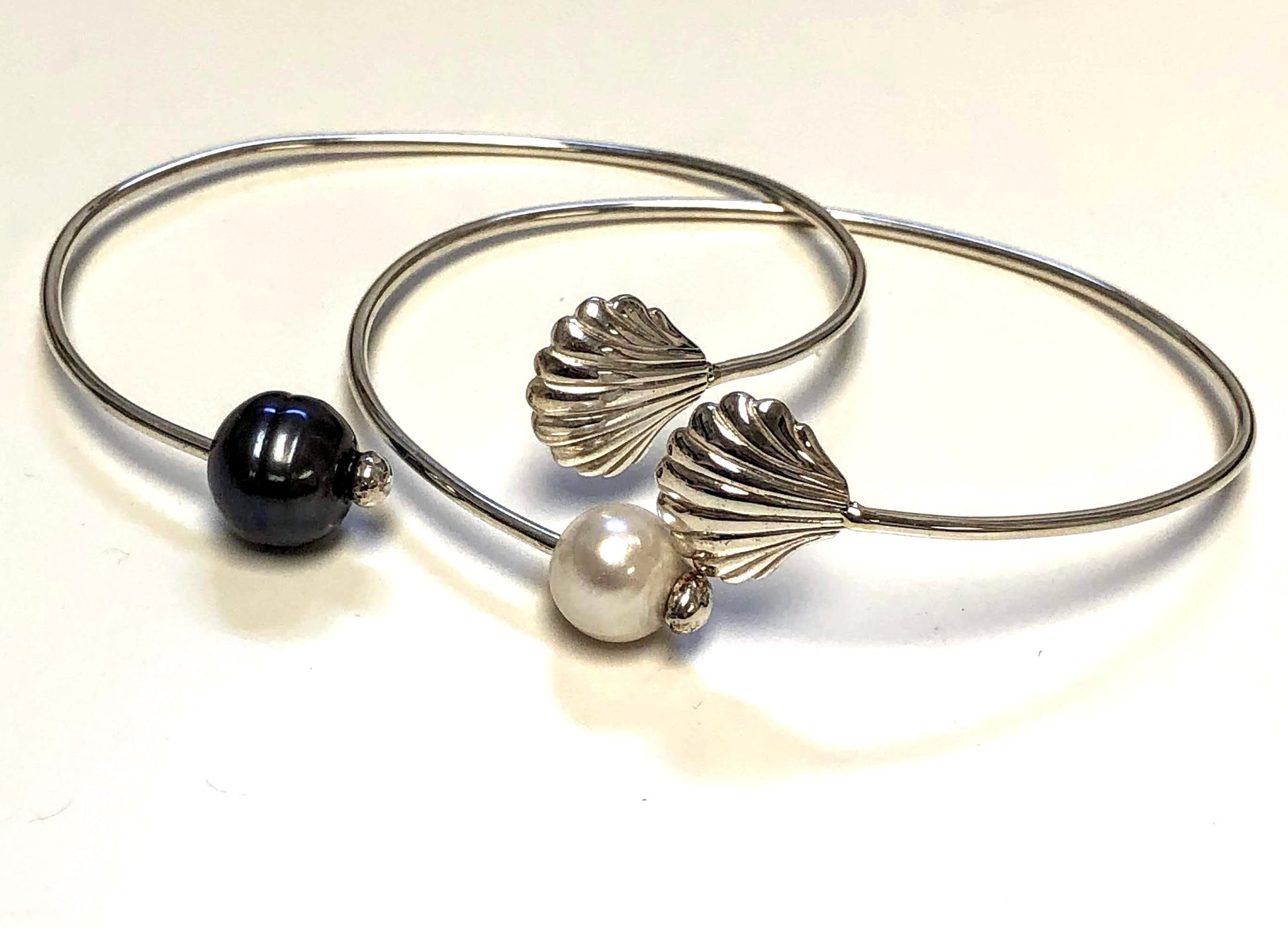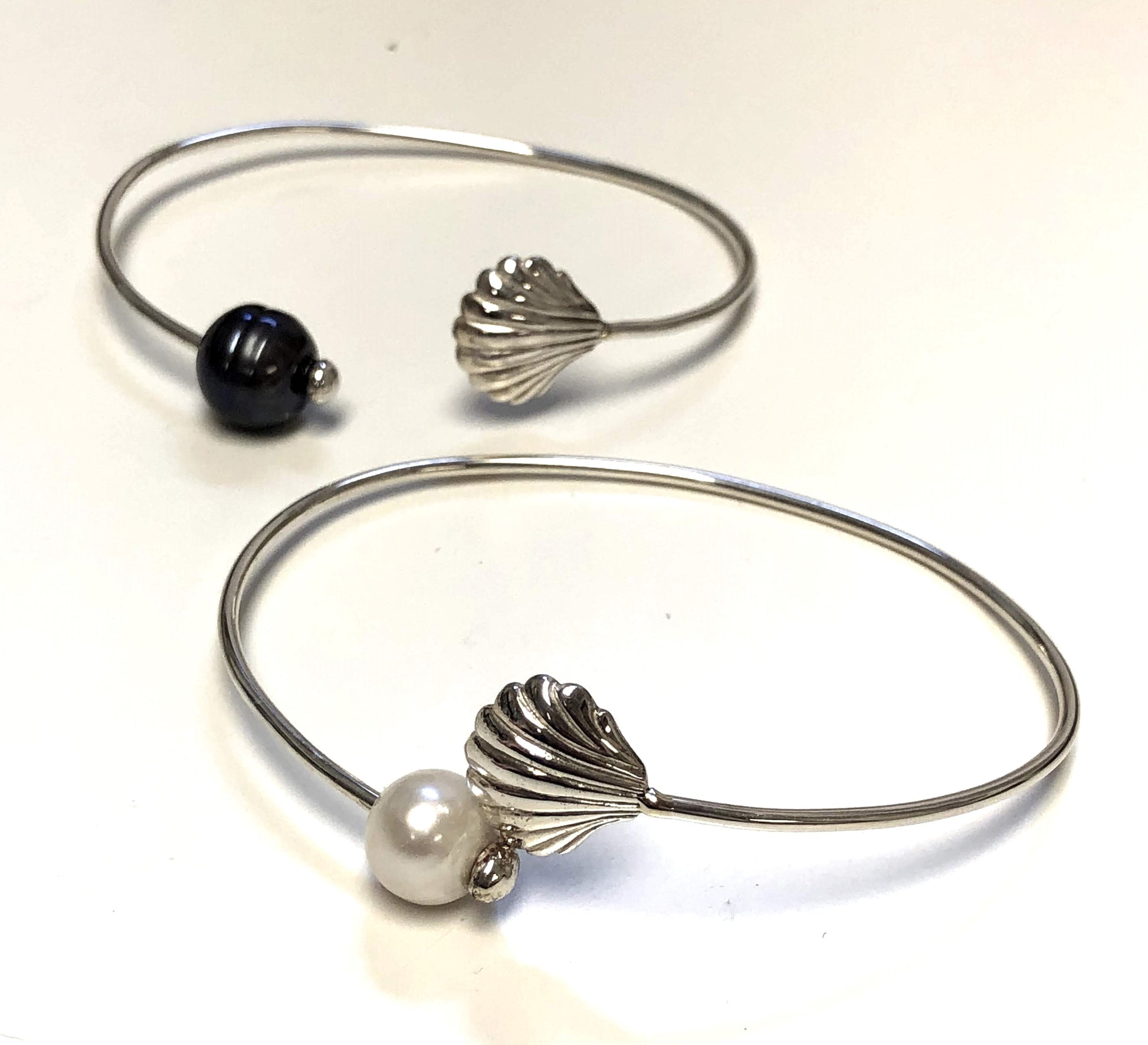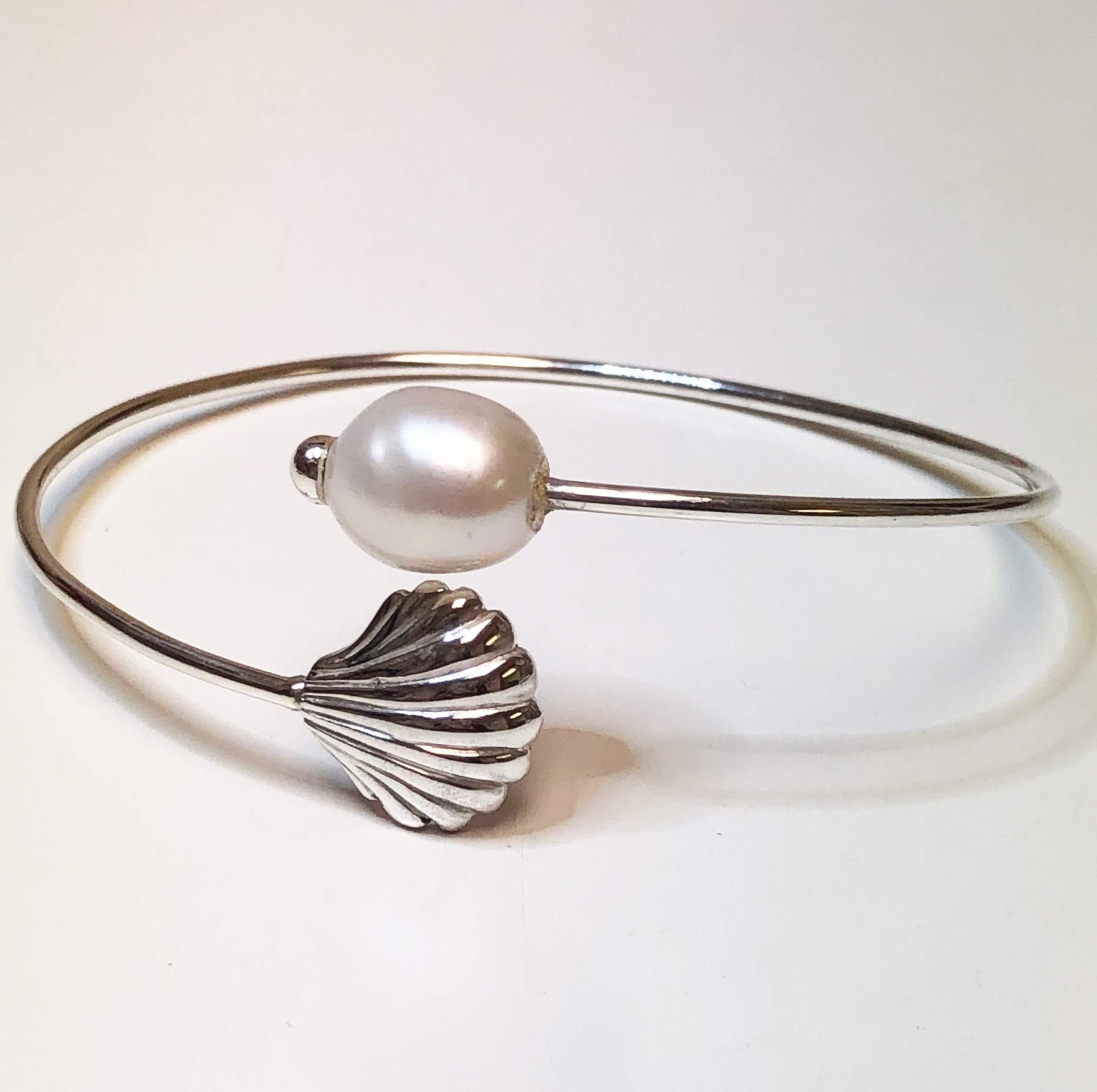 A beachcomber beauty! Perfect for any beach lover, our pretty sterling silver scallop shell is designed as a wrap cuff and paired with an elegant white or black freshwater pearl and perfect for day or night. This lovely scallop shell bracelet is custom made in our Cape Cod studio, solid sterling silver and polished to perfection. A stunning piece worn alone or accented with other pretty bracelets. Fully adjustable to fit most wrist sizes.