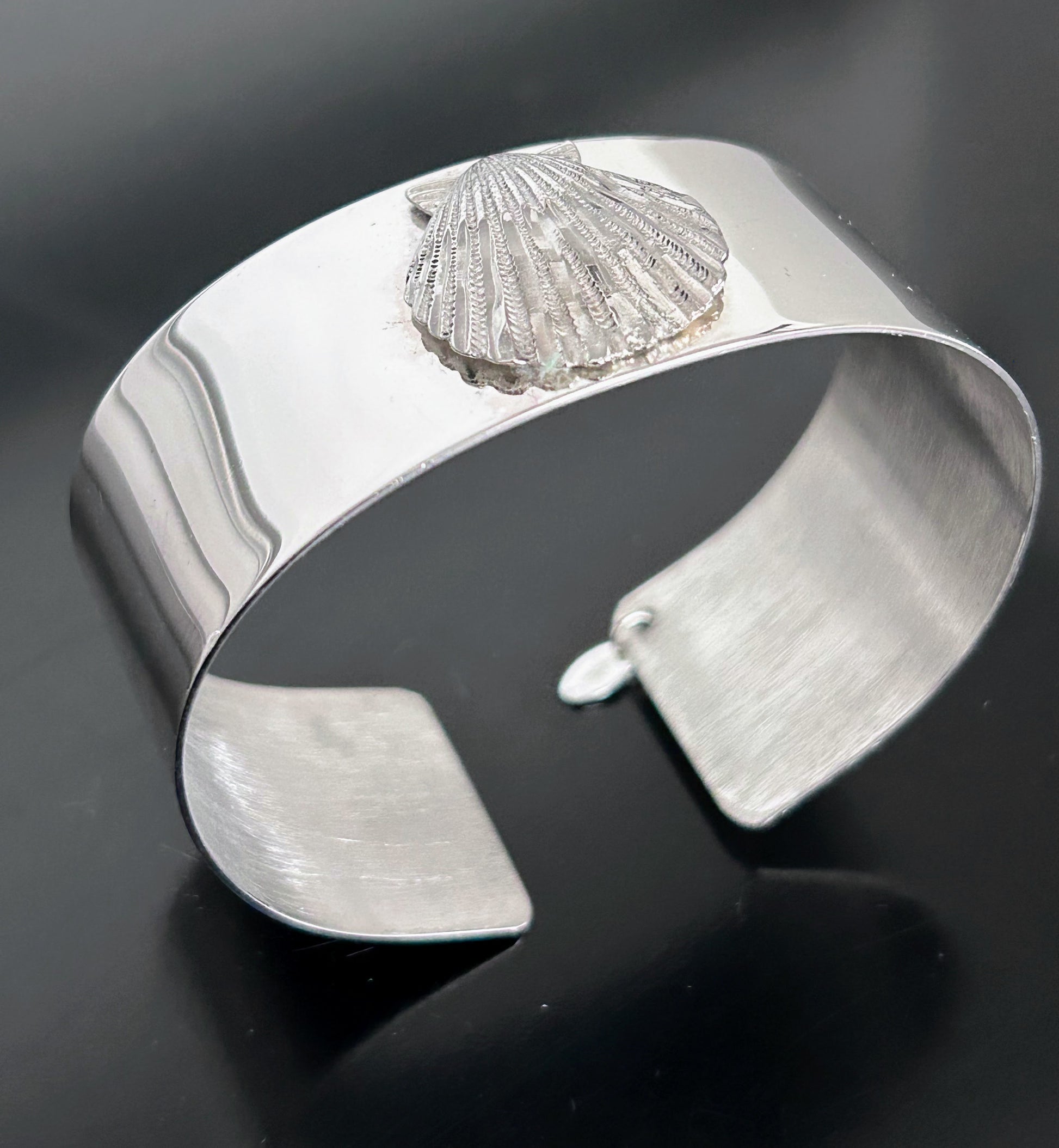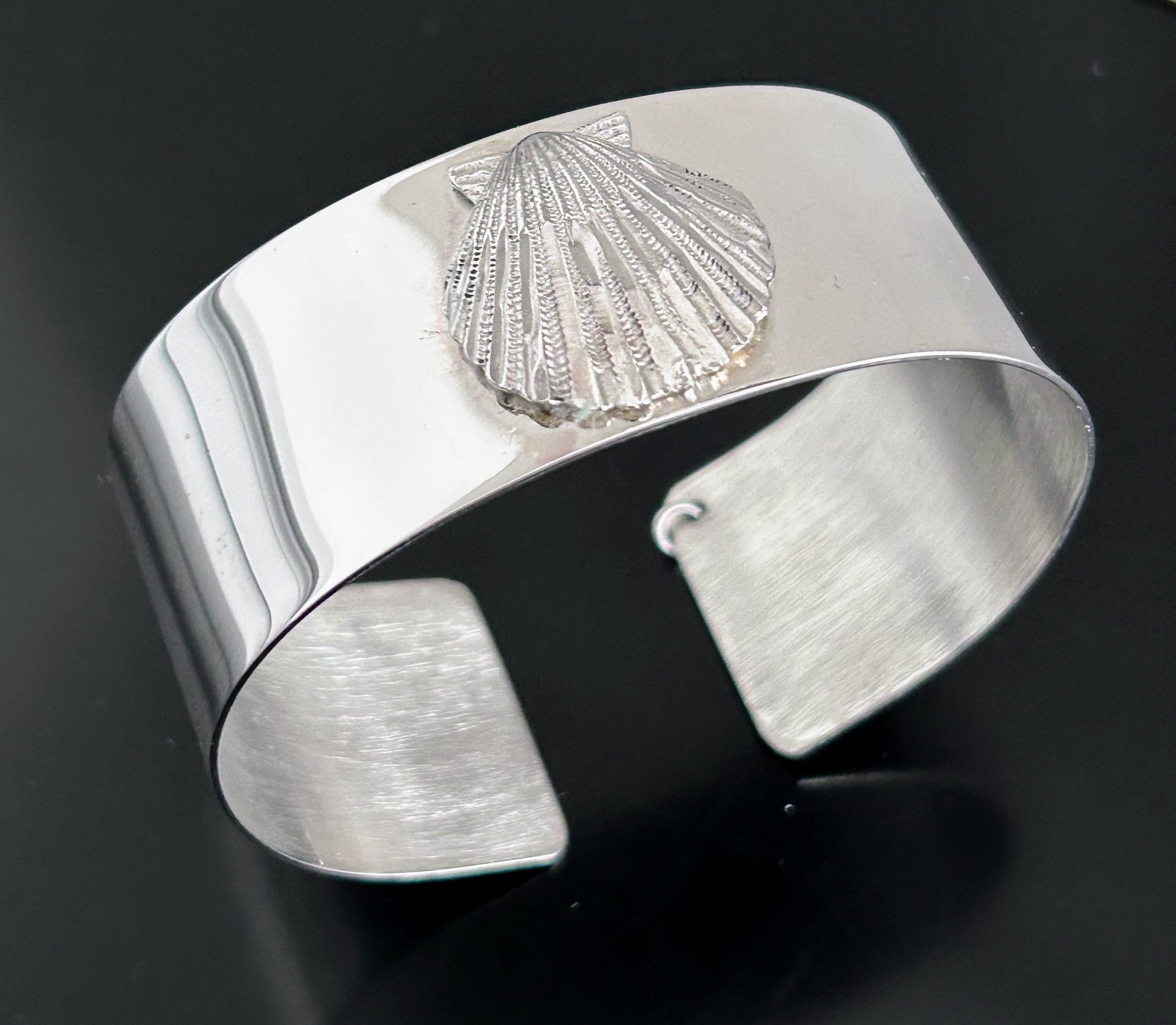 STUNNING! is all that can be said about this unique cuff bracelet. Handcrafted in solid sterling silver, a beautifully detailed Sterling Silver Scallop Shell sits atop a high polished cuff style bangle creating a comfortable on/off style. Designed and handcrafted in our Cape Cod studio. This beautiful piece is sure to turn heads. Perfect for any beachcomber. One size fits most. We are happy to accommodate special sizing requests, please message us at check out and we will happily respond.