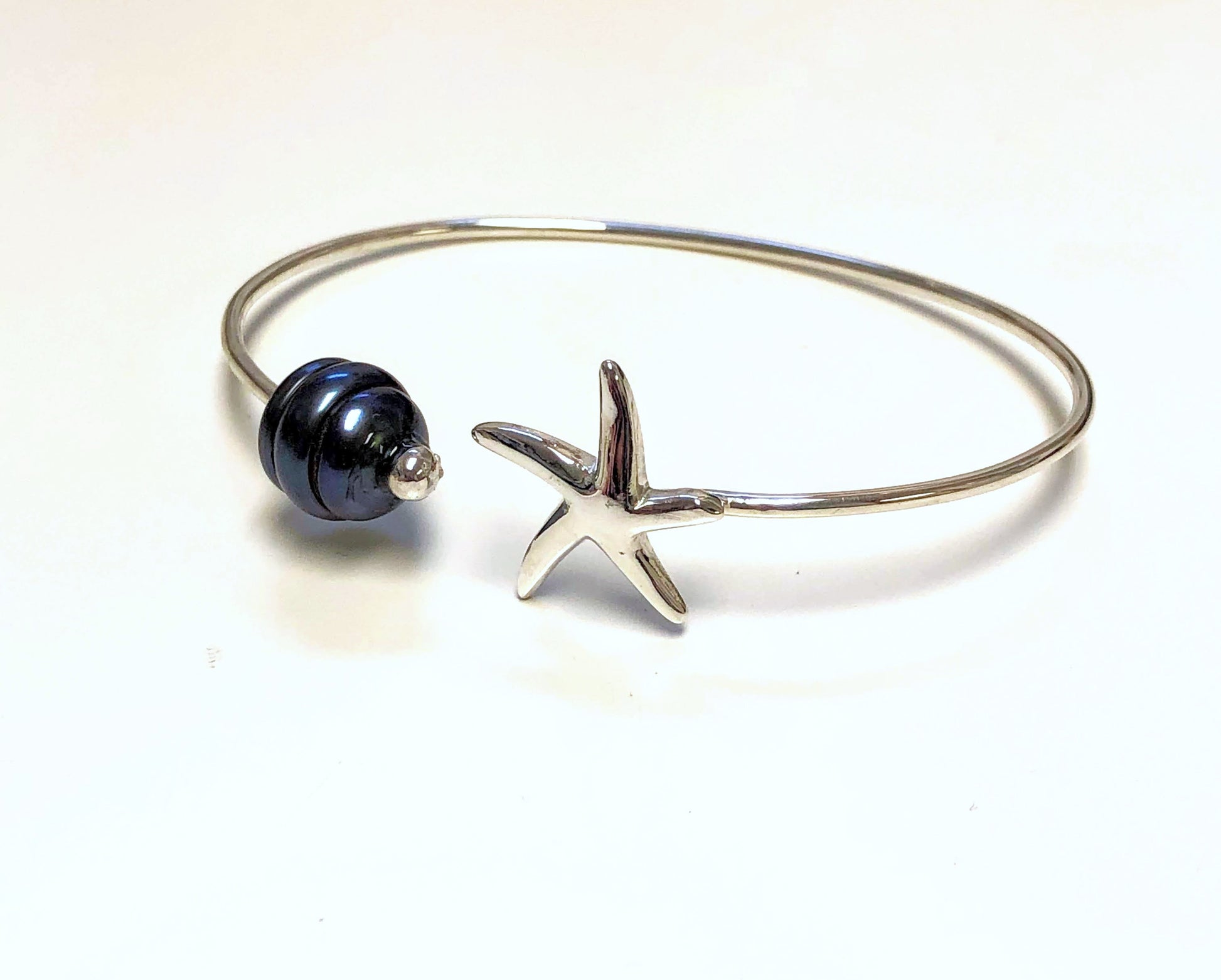 A Seashore beauty! Perfect for any ocean lover, our pretty starfish is designed as a wrap cuff, paired with an elegant black or white freshwater pearl and perfect for day or night. Our lovely starfish bracelet is custom made in our Cape Cod studio in solid sterling silver and polished to perfection. A stunning piece worn alone or accented with other pretty bracelets. Fully adjustable to fit most wrist sizes.