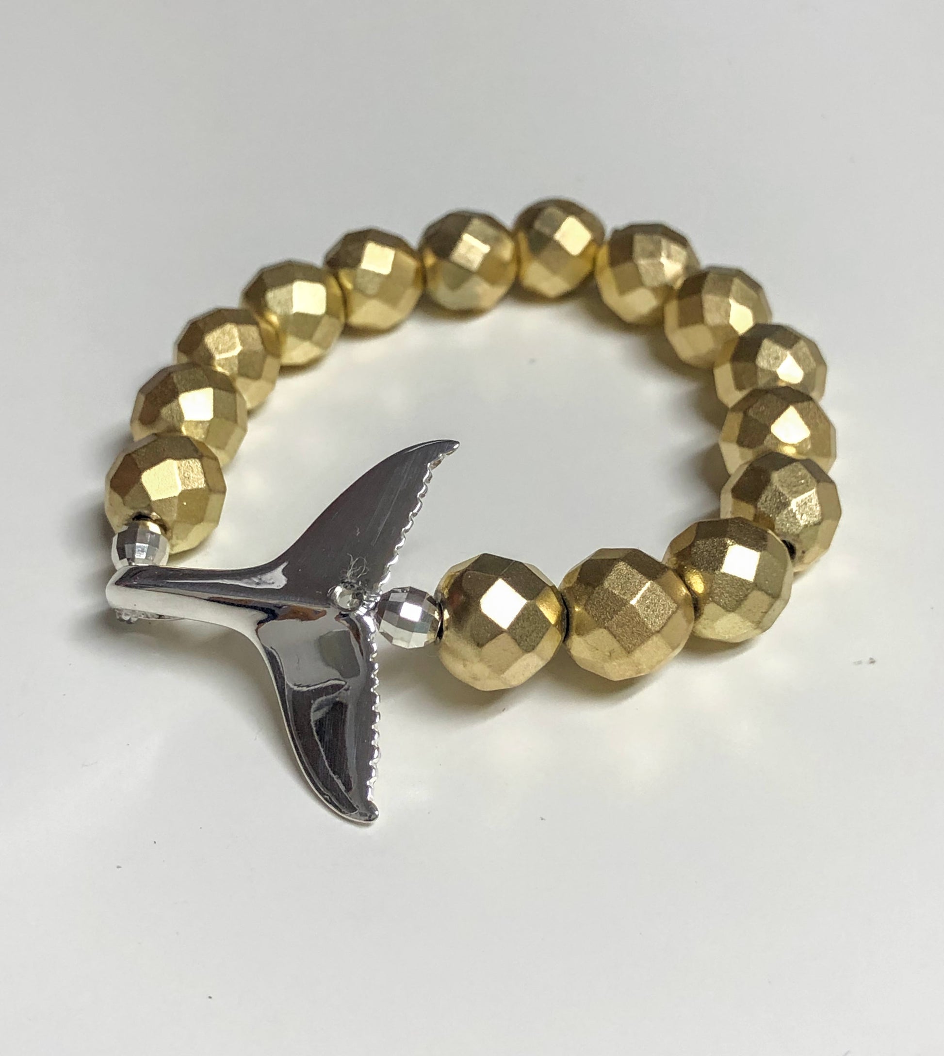 Our stunning Whale Tail, cast in solid sterling silver is paired with beautiful Gold Hematite gemstone beads and hand strung on super-strong stretch cord. An easy slip on/off style is accented with sterling silver beads, a classic nautical bracelet, meant to be worn day and night. The perfect bracelet for any Beach girl!