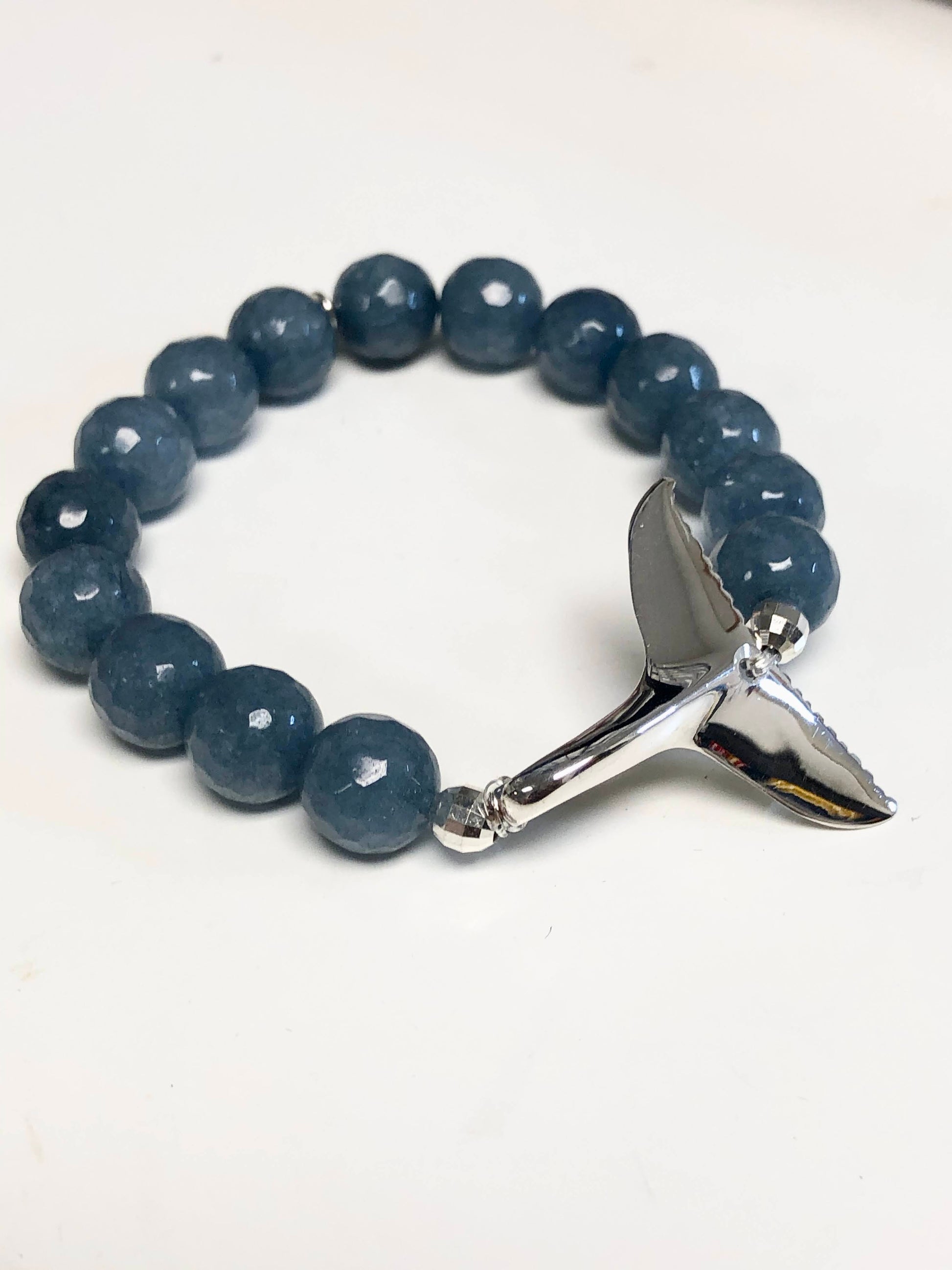 Our stunning Whale Tail, cast in solid sterling silver is paired with beautiful Steel Blue Jade gemstone beads and hand strung on super-strong stretch cord. An easy slip on/off style is accented with sterling silver beads, a classic nautical bracelet, meant to be worn day and night. The perfect bracelet for any Beach girl!